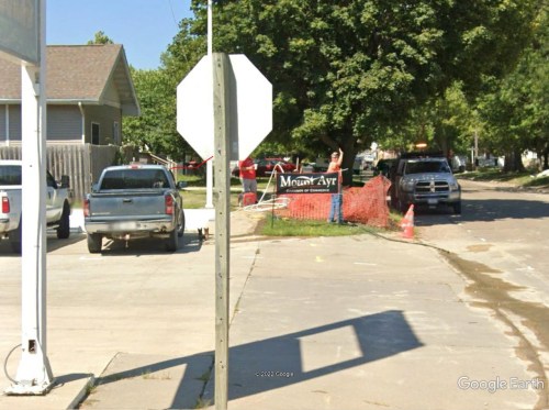 We are almost certain upon passing that this orange clad guy is welcoming us, the viewer, to Iowa. And the 2 little, alert dogs to his right (our left), one black and one brown? Welcomers as well?
