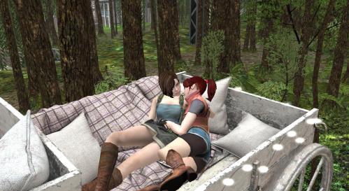 “I’ll take my chance on the 2 day old version. I just need (sigh) a *break*. One day. I can just sleep out here under the trees and stars. She leans back. “Just go away, please. One day,” she reiterates, and climbs into the wagon bed to lie down.