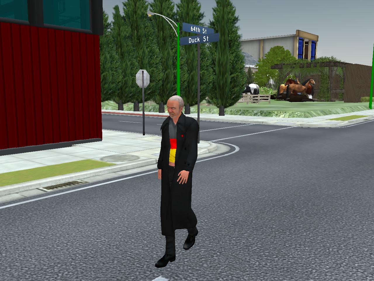 Newt walks down 64th exactly aligned with longitude 64 in the sim. He’s just done the same in Big Woods sans a road to follow, trying to also figure out the lay of the land there. *There* has shifted to here. Witness the Duck in the background (!).