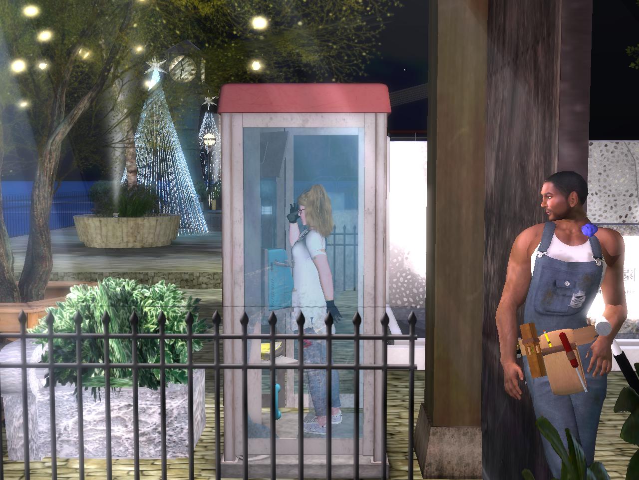 “Hello?” she starts the roleplay. “Is this the Moon?” She slams the receiver back into its carriage. “Damn thing’s broke — no *4*!” On cue, a telephone repairman saunters up to the booth outside, loaded down with the tools of his trade around a maximized belt. Until he dispenses with it.