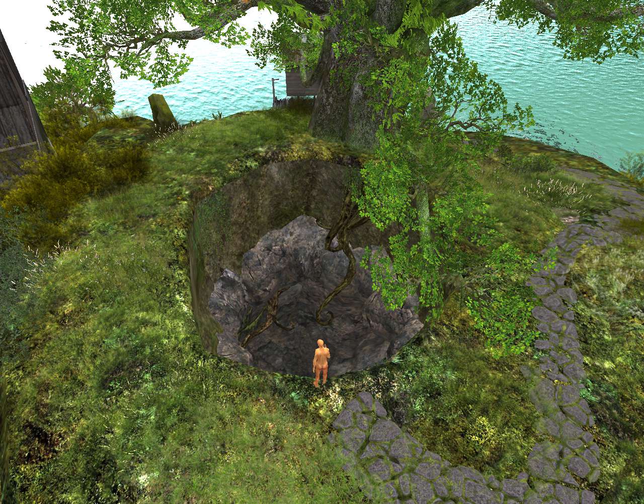 A woman, also naked but with a bit more protection, 2 bits more but white roses not red, was way way down at the bottom, sitting on what appeared to be a pier by a pool.
