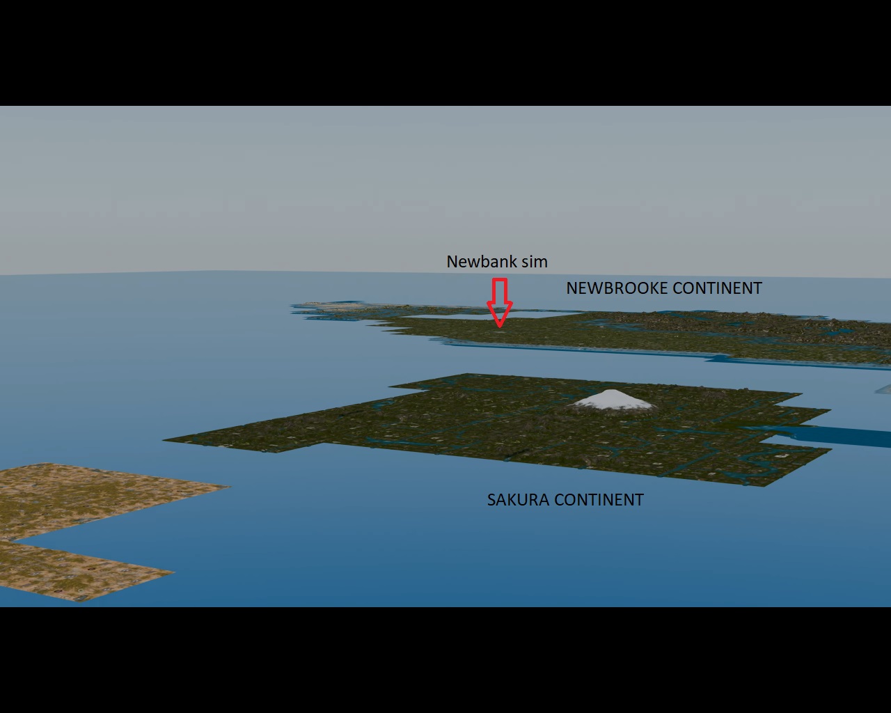 White mtn. centered continent often called Sakura in the foreground with the Newbrooke continent with its central Newbank sim in back