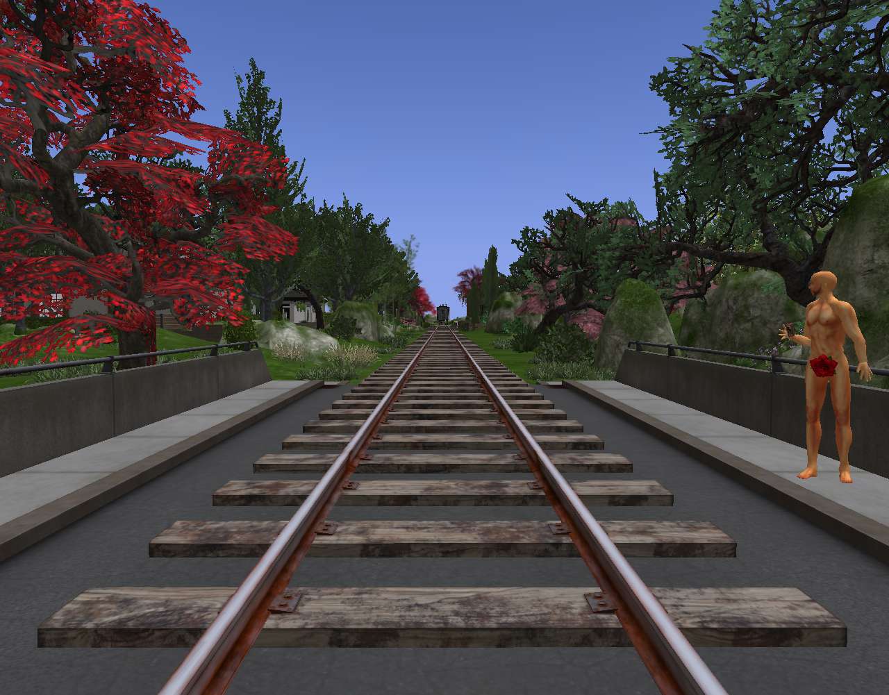 Still protected by a single, large red rose in a moderately rated sim — good enough — I peer around at my surroundings, note a train car in the distance down the straight as an arrow tracks in this location with my 168 meter draw distance. That must be it, I reckoned.