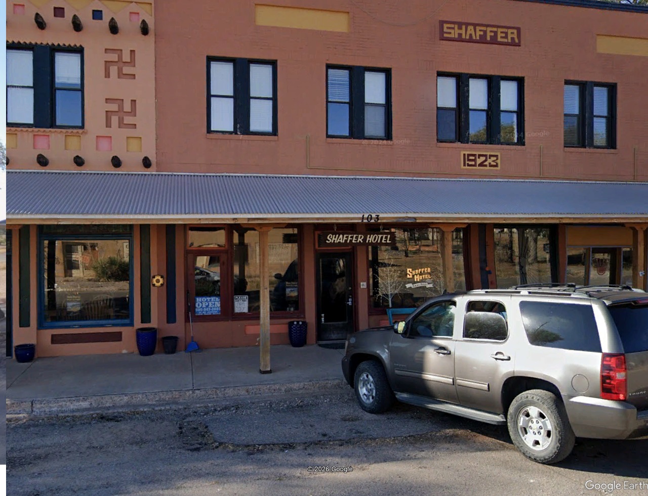 Barry De Boy stands in front of the Shaffer Hotel in Mountainair, realizing that he had already checked into a room here in 2023 and then never left. Yet this is also his first time visiting. Time forms a loop in this place and disappears into a Vortex of some dimensions, some dimensions indeed. All of this was pretty much covered in photo-novel 37 sections 1 and 2 and a bit in section 3. I don’t think we need to rehash the story here. Moving on, then…