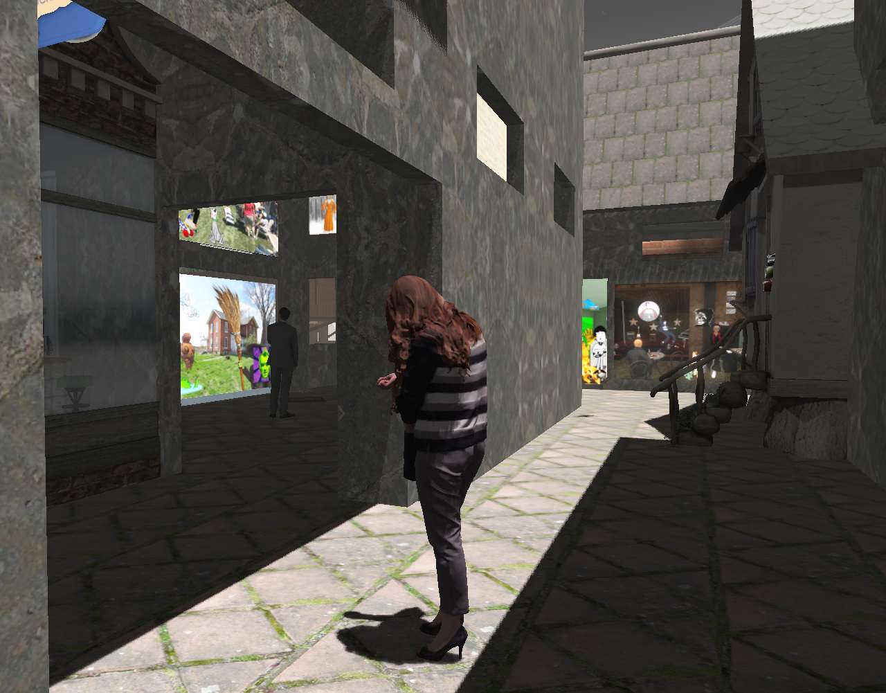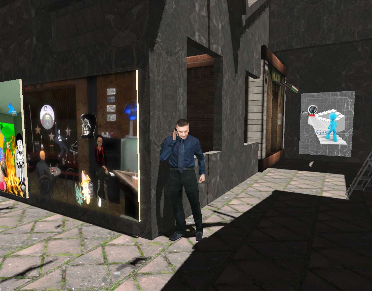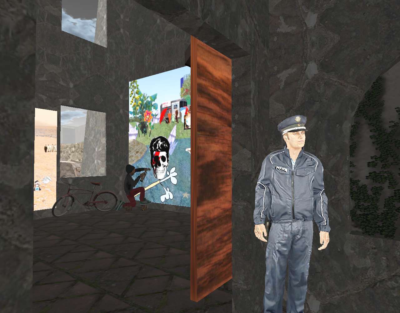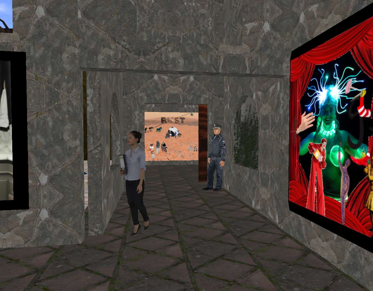Concrete gallery is now open in NVFS’s Cement Village, featuring 39 piece from my Bogota collection of collages created in 2016-2026 (photo-novel era). Also in the village currently are Ray’s Pizza, VWX Detective Agency, and a key shop. 1 beat cop from the Nawt Vaya Free State police department has been assigned to protect the collection and businesses.