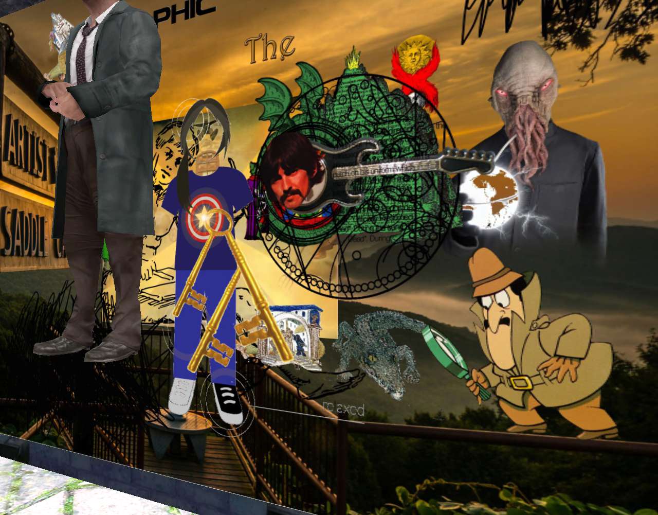 “We can even pull him directly forward through the (detective agency’s) wall, see where he’s position in respect to the collage. What’s he staring at now? A crime! Vandal, just like the policeman assigned to the town is distracted from by the passing pretty lady. Pretty can solve it, I mean, Petty. Petty crime too, perhaps. And that’s just one meaning. He *knew* where to place the time machine,” Hucka D. reinforces. “And as I’m sure you’ll notice, Petty is inside the collage too, magnifying glass in hand. He studies monsters.”