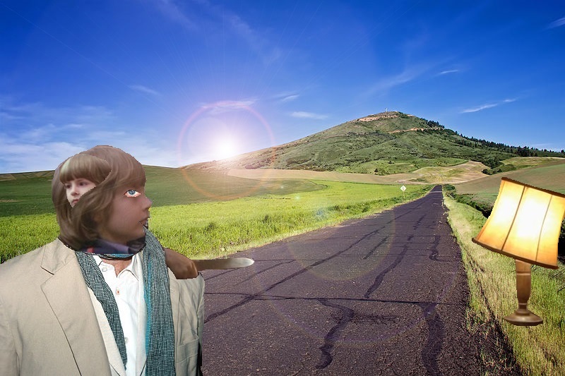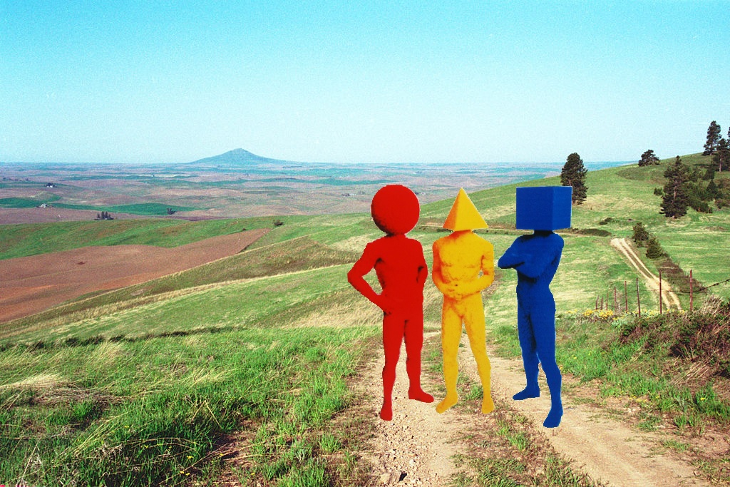 Story Room is the red figure with the sphere topped body. He’s the boss. He calls the shots. *From* him (or her) emerges two more figures: the yellow, tetahedron masked being we’ve identified with Tom’s Petty High (variant of Tom Petty and the Heartbreakers), and then the blue cube topped figure identifed with REM (variant name pending) and lead singer Steptoe Butte (Michael Stipe variant). The new little collage series, also named “Steptoe”, seems to be more about attempting to structure a variant name for REM/Michael Stipe, to follow up on the seeming success of the transformation of Tom Petty and the HB to Tom’s Petty High. The chosen name for Stipe is, first and last name, Steptoe Butte. This comes directly from a very interesting landscape feature of the same name in eastern Washington state, depicted in the distance in the first collage above. Why Steptoe for Michael? Okay, so this was the lead-in: in looking up Stipe in a geographic database, only a handful of entries came up. One was Stipe Cemetery very near Steptoe Butte. So it was examining Stipe Cemetery on maps and photos that led me quickly to this butte. I found it interesting that if you replace the “o” with an “i” in the “Steptoe”, you’d have an anagram of “Stipe”.