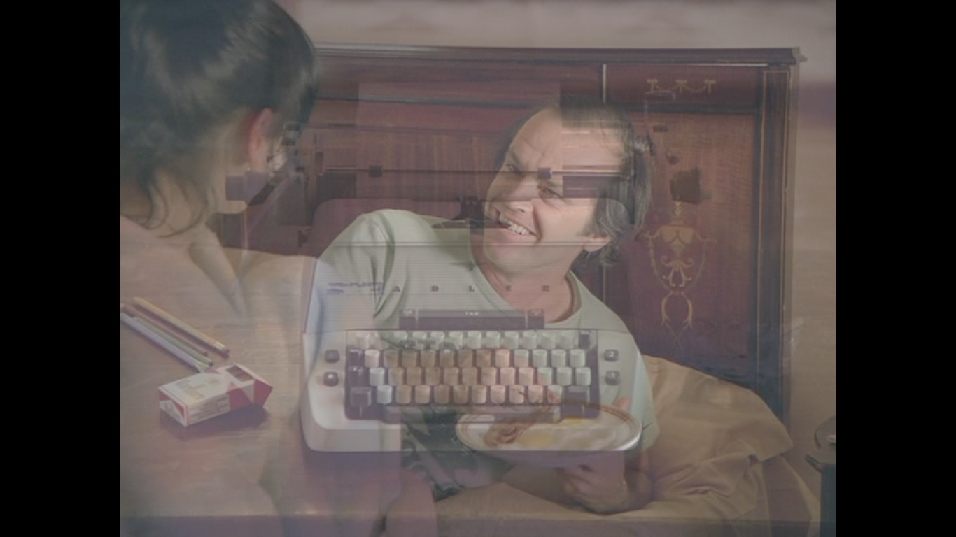 I’m convinced of this now. Except he collaged together different elements of his films, including segues between shots. Else you can’t explain why Jack’s light colored t-shirt aligns so perfectly with the white edges of the typewriter here in the crossfade between shots 171 and 172. The t-shirt advertises Stovington High (a name taken directly from the Steven King source book) and their mascot, the eagle. The typewriter we crossfade to here is an Adler, which means “eagle” in German. There’s also a more stylized eagle emblem on the typewriter above the brand name. Jack’s t-shirt, in the fade, begins to say A D L E R instead of STOVINGTON as his arm moves in front of the latter. There’s no doubt about it: Kubrick wanted the Stovington Eagles and the Adler typewriter and its eagle emblem to be *directly* connected. Second eagle replaces the first.