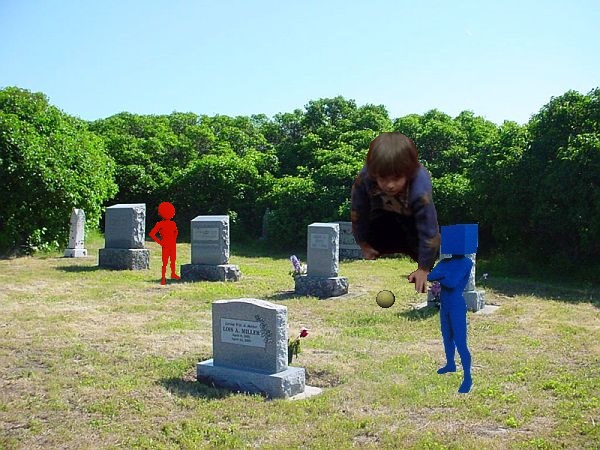 Danny of The Shining reappears on the edge of this cemetery. He’s discovered the top of the yellow figure in the preceding collage, hopefully just the tetrahedronal mask and not his whole, mostly buried body (!) Collage 02 actually comes in two parts. As Danny is staring at the golden tetrahedron, it changes, in the resulting animation, into his yellow ball from Collage 00, the one that rolls up to him apparently from the now open Room 237 and seeming to invite him into that sinister lair. What’s this ball now doing in Stipe Cemetery in Washington state?