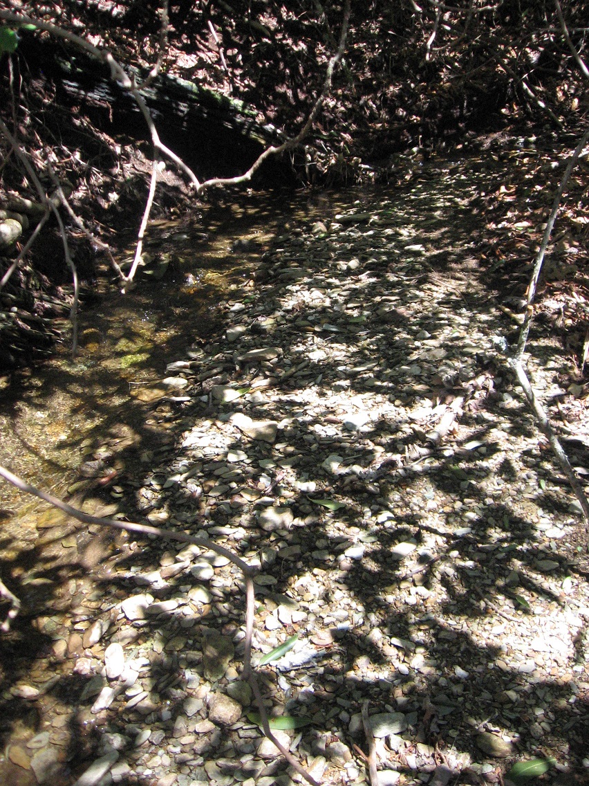 A shot of the old blue can (foreground) with a log bridge in the background (not the arched one, but the straight one just below it) that’s been dubbed The Bridge of Blue and Purple. Appropriately we have this blue can on one side of it, and about the same distance on the other side (closer to Damsel Island and Concreek), a purple soda can. I’ll have to go back (perhaps today!) and take a closer look at these equidistant containers.