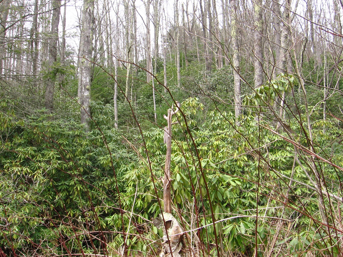 I didn’t want to go too long without supplying the text for this particular post concerning Whitehead Crossing, which gives pictures from probably my most successful and satisfying day of hiking in the area. Most of my pictures didn’t turn out that well however. It’s tough to take good ones in such confined areas. Below is the example of some stuff I had to crawl beside to get from one place to another — rhododendrons abounded. I had to be more mindful of hiking choices, else I could get not really lost, per se, but end up having to backtrack a longer way. I was attempting to let the woods tell me the directions I should go. And, lucky for me, it pretty well worked!