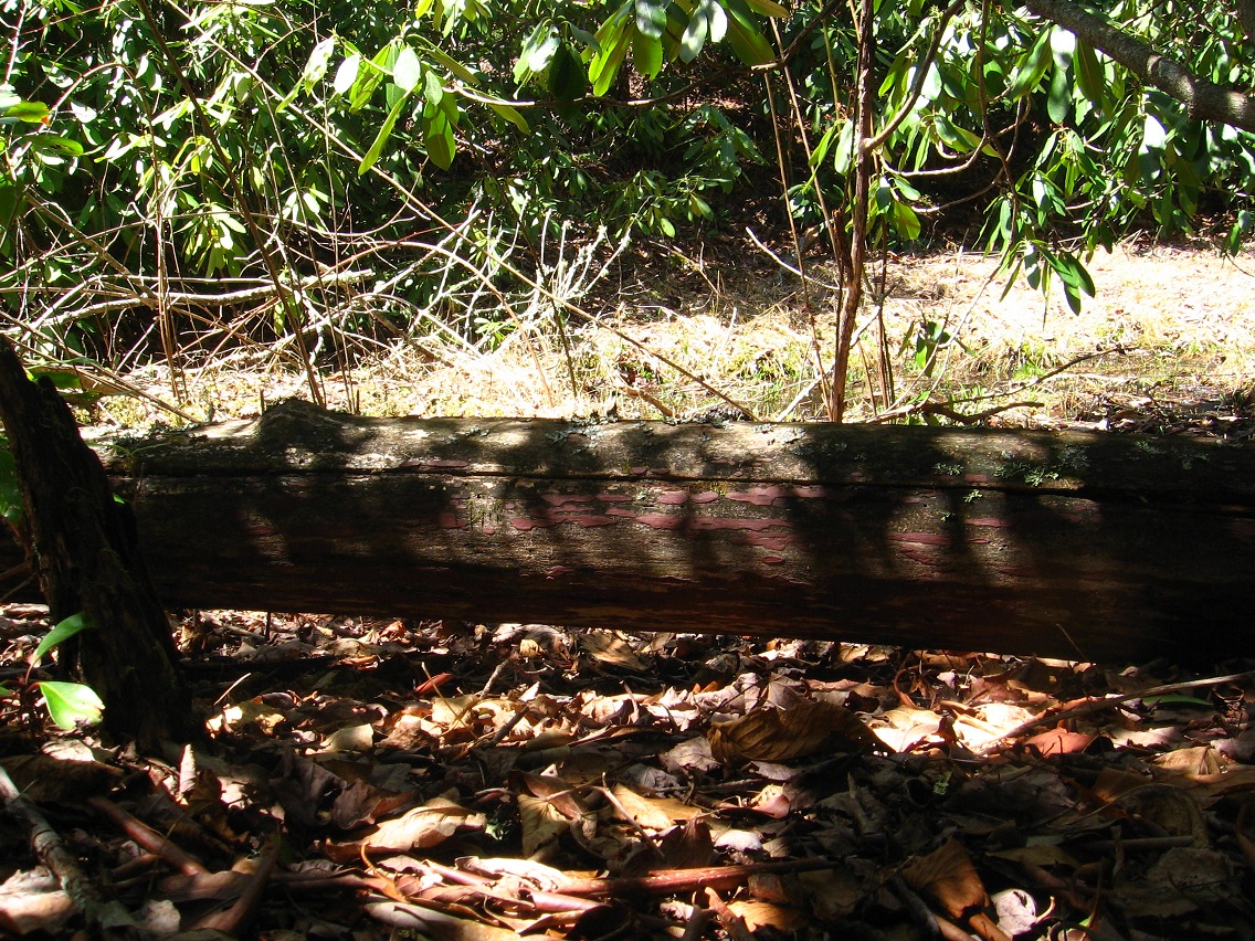 The Land of Blue and Purple, as I’m currently interpreting it, is technically entered by re-crossing Green Stream via the log bridge mentioned above (equidistant between the blue and purple cans, once more). A clear area in the mainly rhododendron clogged region marks the location; all you have to do is cross the bridge and walk uphill a bit to reach it. But in truth the Land of Blue and Purple seems more a red herring, for the actual focus of this bridge appears to be The Totem, followed from the opposite direction. Appropriately I may call the capital of the Land of Blue and Purple Red Herring, and even mark it with that red rock I found in Concreek this same day of picture snapping. But let’s move to the area of The Totem, a quite mysterious object indeed.