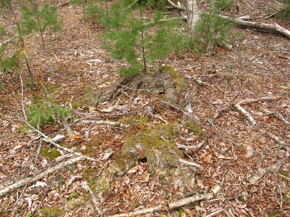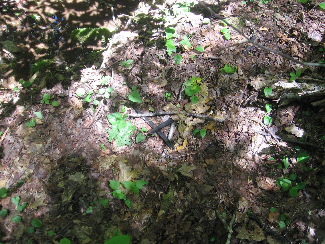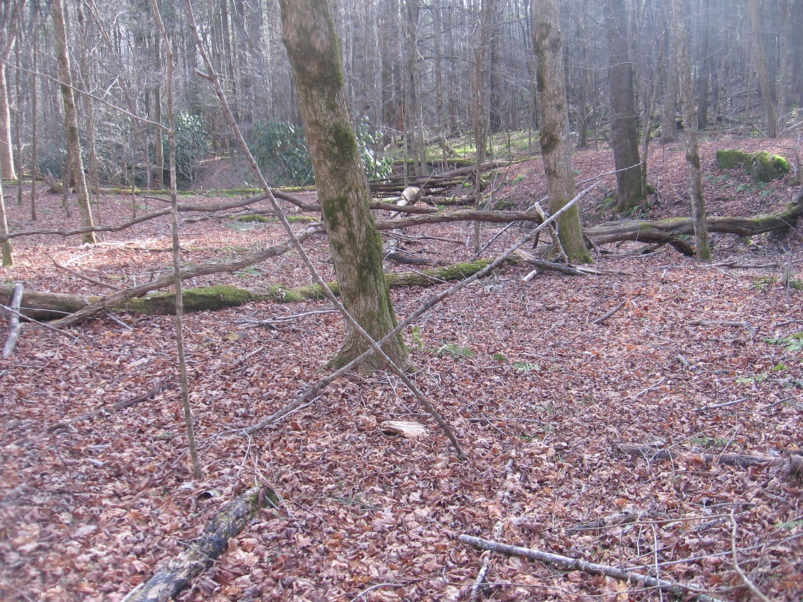 Yes, it’s what it looks like it is. Two, in fact. The place has been called Dogpatch. It’s what lies beyond the rhododendron if you kept following that same ridge further south. It’s almost completely inaccessible from all directions — there are, in fact, only two rather narrow ways in through the woods, both of which come up the ridge from the sides. Another camping spot has been created sometime in the past (pictures forthcoming, perhaps) in the same general area and on the same ridge (at the top of one of these two entrances), but far enough away that I’m not even sure that they knew what they were camping near. Perhaps they wouldn’t care. I think I’d care, without knowing more details. And for one of the two, there’s really no more details to find. That’s the major mystery part, it seems.