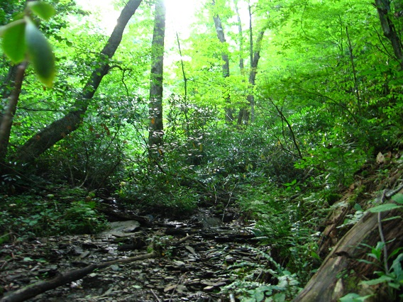 I’ve found a path linking Missouri on the ridge to the west (same ridge with the Kentucky platform further up, once more) to this rock filled and more spread out, circle shaped part of Byng I am standing in for the below picture. Just downstream from here, we can spy the dark silhouette of a large, dead tree that perhaps represents the center of 6 Minute Hill. More on that soon as well.