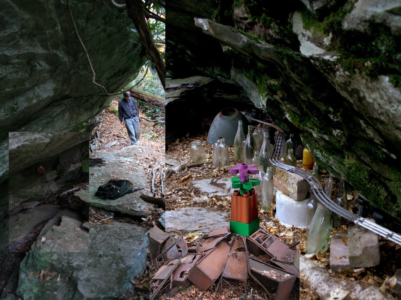 For Billfork (Spring 2012) and Lion’s Roar (Fall 2012) this came from sites of torn down houses and structures in Herman Park each. For Bigfoot, outside the protection of Frank and Herman Parks, the objects were found at the Plateau of Raw Art (site of old high school). Ruins are a key link. The smaller art event called Falmouth (Spring 2013) also contained some junk objects, most of which were old bottles. Same story there: came from nearby site of old house. Billfork and Lion’s Roar had a lot of bottles as well. Then there’s the basically unpotentialized Whitehead Crossing with its 55 or so bottles laying around in a pile.