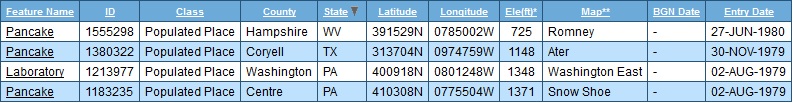 Laboratory, Penn., an unusual name in itself and now connected to the “Beaman’s Laboratory” in Falmouth’s “Beamen” college, has an unusual variant name in Pancake. To remind, this Laboratory (there’s 1 other pp in US with this name, near Lincolnton, NC) was uncovered due to another listed variant name of Marlinsburg.