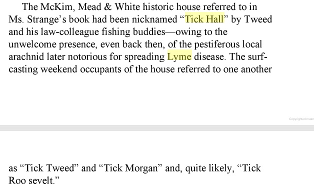 The McKim, Mead, and White historic house referred to in Ms. Strange’s book had been nicknamed “Tick Hall” by Tweed and his law-colleague fishing buddies — owing to the unwelcome presence, even back then, of the pestiferous local arachnid later notorious for spreading Lyme disease. The surf-casting weekend occupants of the house referred to one another as “Tick Tweed” and “Tick Morgan” and, quite likely, “Tick Roosevelt.”