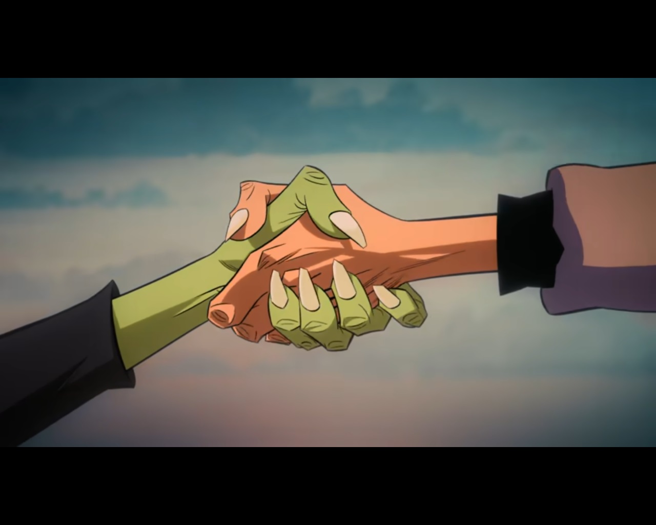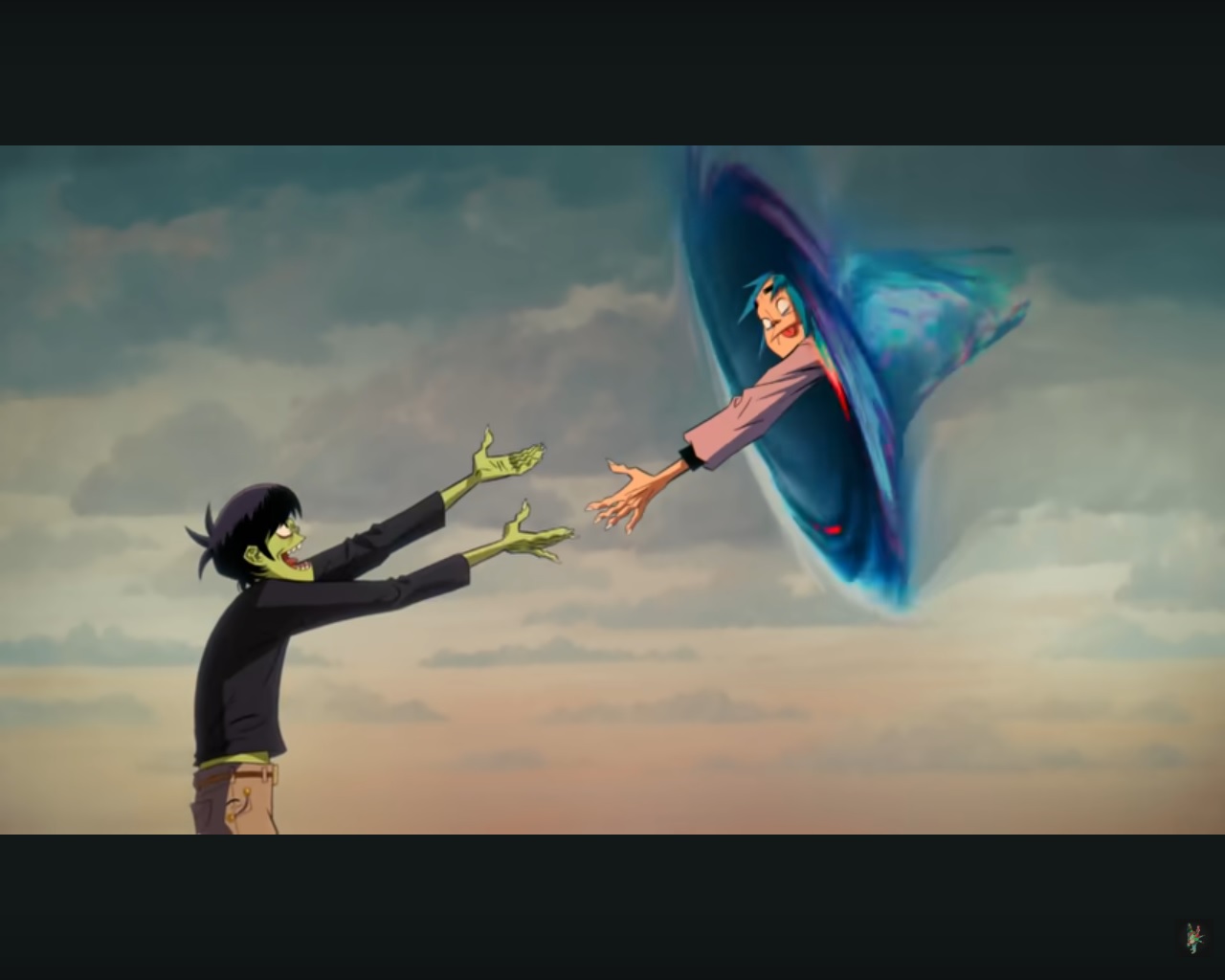 I needed Murdoc and Murdoc needed me. As he’d saved me before now I must save him. Or is it the other way ’round? Never mind: we’re a team moving forward from this day on, beyond the Plastic Beach where we came from to get this far. But not (a team) in that way, never mind there’s nothing wrong with that way. It’s just not ours. We’re what they call *ordinary*; not reversed, not retrograde. In that way again. With my elastic arm, I pull him into the portal with me and the others and we continue…