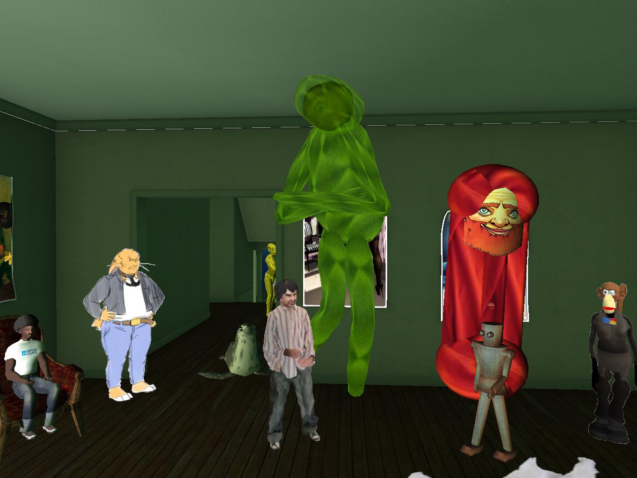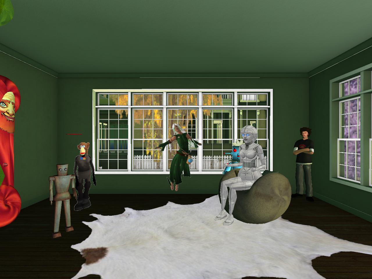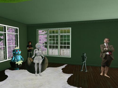 Then continuing our introductions, we have Ben Thar (Mr. Bean cutout, actually) beside the Bunneh 02 art, then Bluebot (counterpart to Redbot across the room), then Second Lyfe founder Philip Linden standing behind Tronesisia in the corner, and lastly Ross C., another robot who may be a servant or some equivalent to the central Tronesisia.