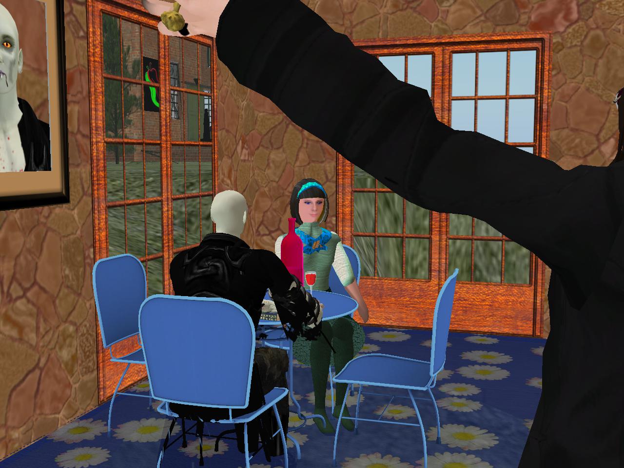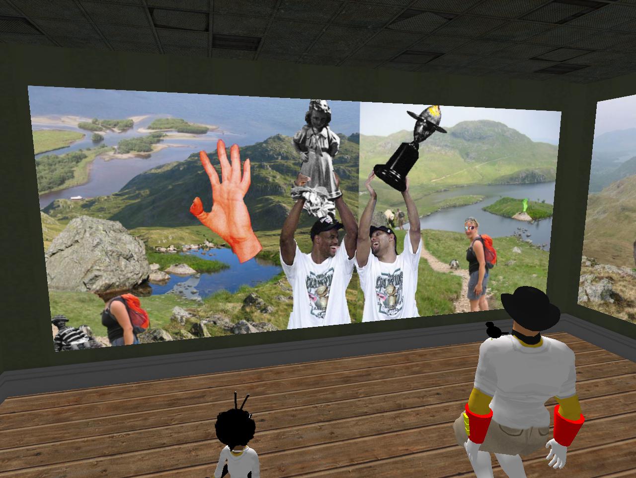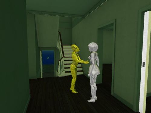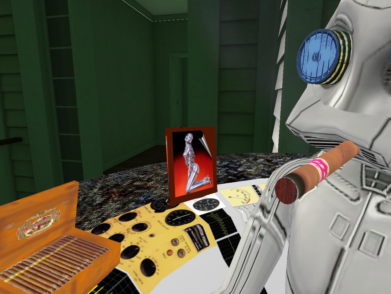 Then continuing our introductions, we have Ben Thar (Mr. Bean cutout, actually) beside the Bunneh 02 art, then Bluebot (counterpart to Redbot across the room), then Second Lyfe founder Philip Linden standing behind Tronesisia in the corner, and lastly Ross C., another robot who may be a servant or some equivalent to the central Tronesisia.