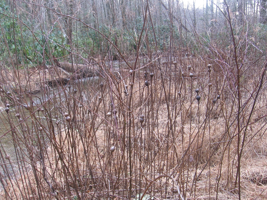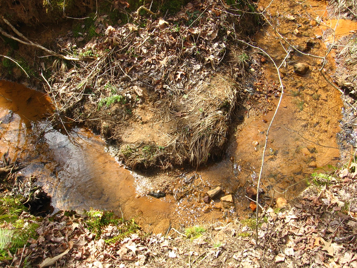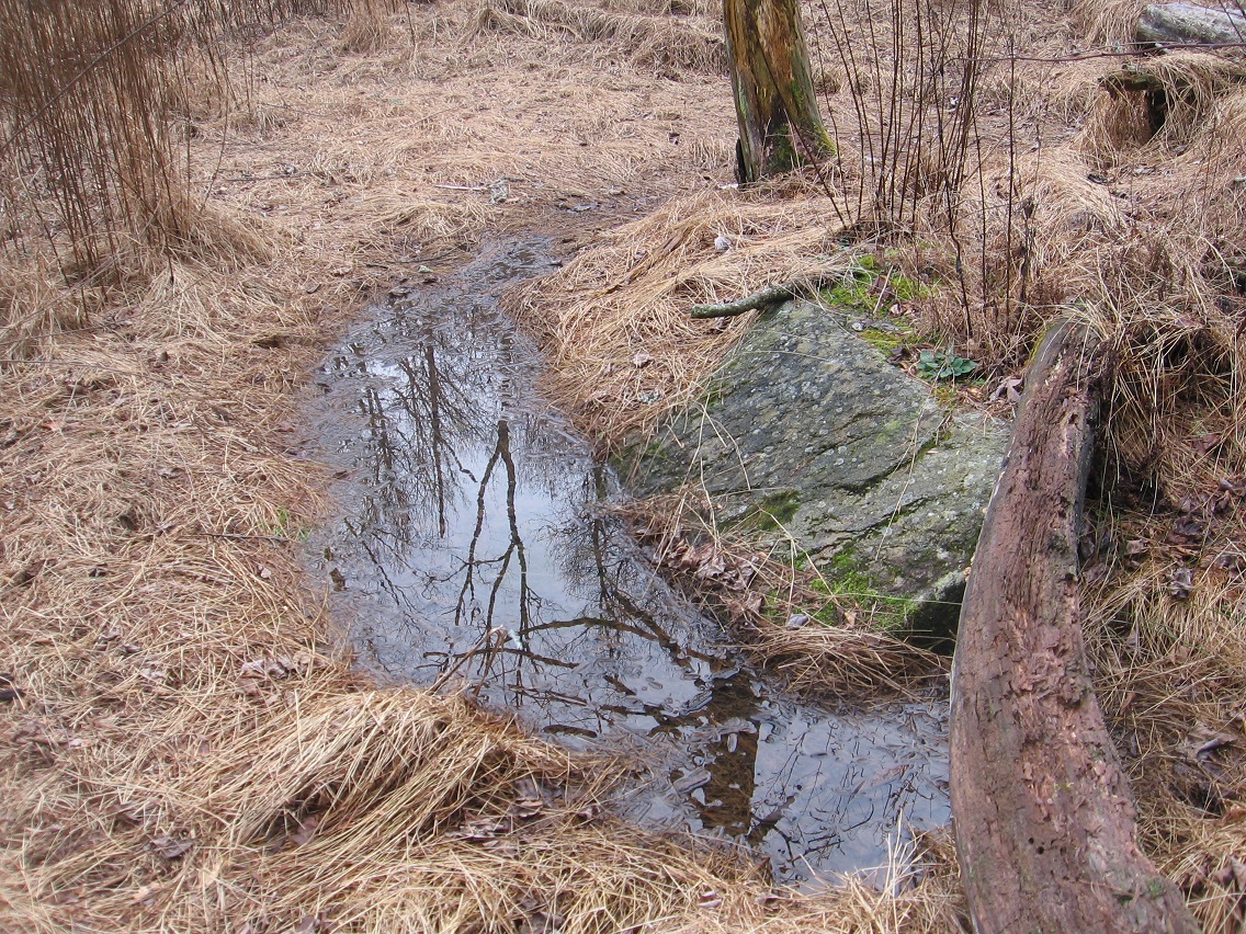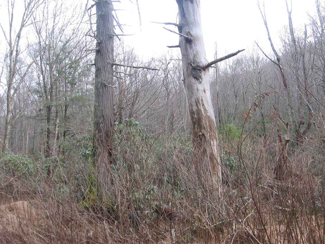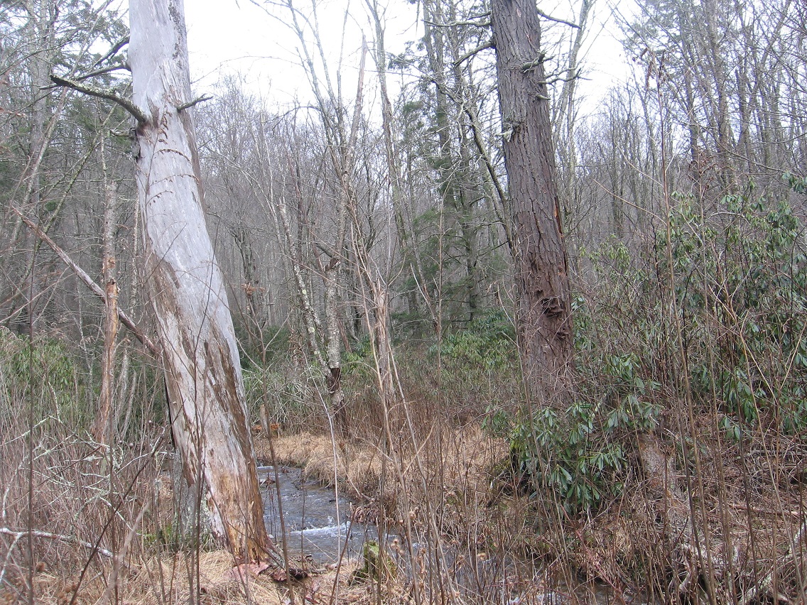 Then we move to the two giant, dead hemlock trees that mark a sort of gateway into the area, acting like Boaz and Jachin pillars in their dark and light coloring respectively, and positioned on opposite sides of The Crossing’s central Green Stream. This would be in the middle of about a 100 foot straight run of the stream I call, simply enough, The Straightway, which traditionally begins and ends with two islands (Rocky I. and Cresent I.). I say “traditionally” here because the composition, shape, and even locations of the islands can change over time.