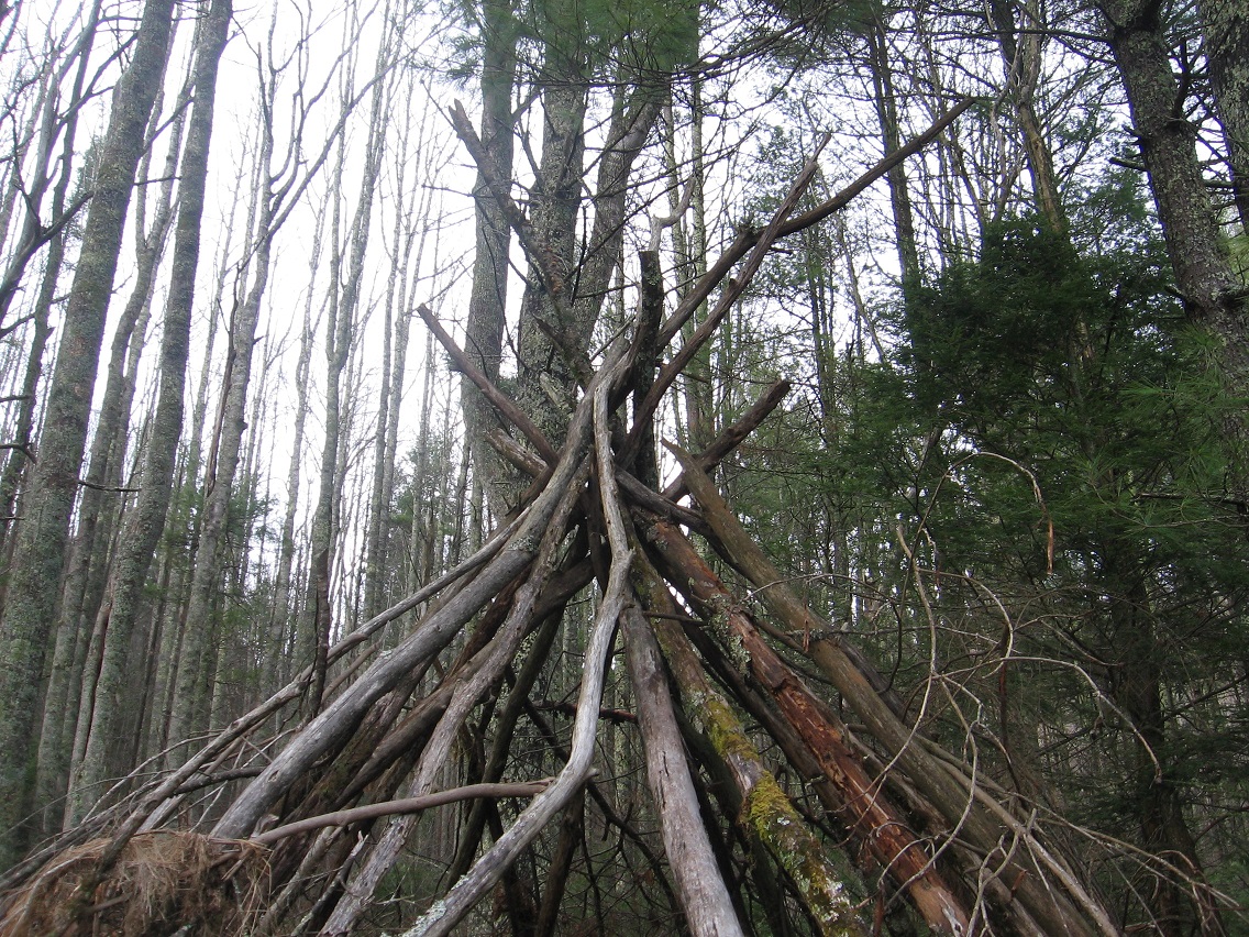We step up from Welcome Matt, and what’s called Matland in general at the top of the Korean Channel, to revisit Whitehead Crossing’s stick teepee next, something built by the hands of unknown others just this past June. I don’t think the structure been used for much of anything since it was constructed, and certainly it was never weatherproofed. I initially feared that someone, perhaps a student at the local collage, would simply move in the teepee for the summer and perhaps longer. But it never happened, and now we just have a useless shell of a thing. I’ve even contemplated knocking the teepee down, but that might bring some kind of bad karma. You have to be careful about altering the nature of the area. The *builders* of the teepee might have “sinned”, but I didn’t want to compound their errors by making judgements of my own.