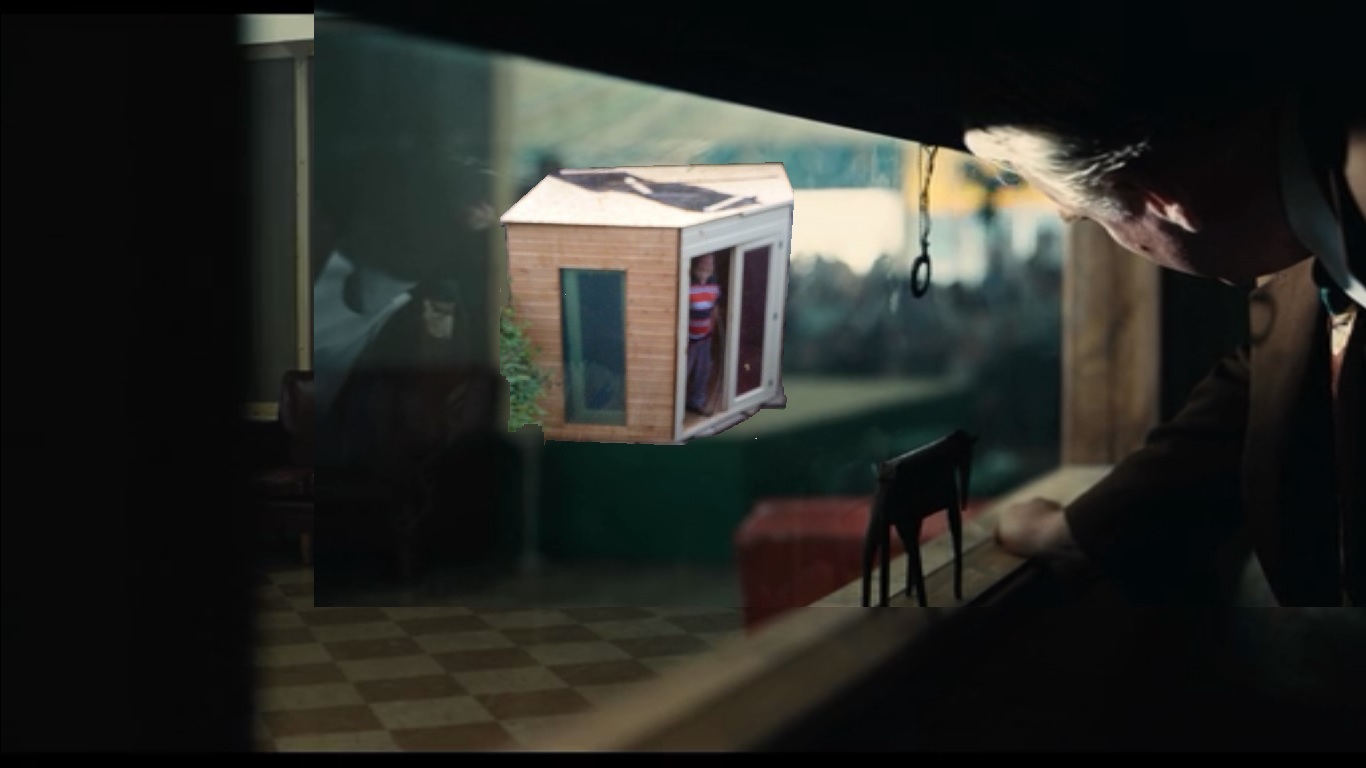 And then on the *right* hand side of Collage 10 we again have the image of Dorothy falling off that confounding pigpen fence, animated this time. The second animation (below picture) shows Dorothy more in the actual state of falling, and this image again directly comes from Collage 07. The first Dorothy (above picture) is more in the process of losing her balance on this fence, causing the fall. “But through the magic of the collage, she instead falls off the roof of this white house, Hucka D.” (pause) Hmmm.