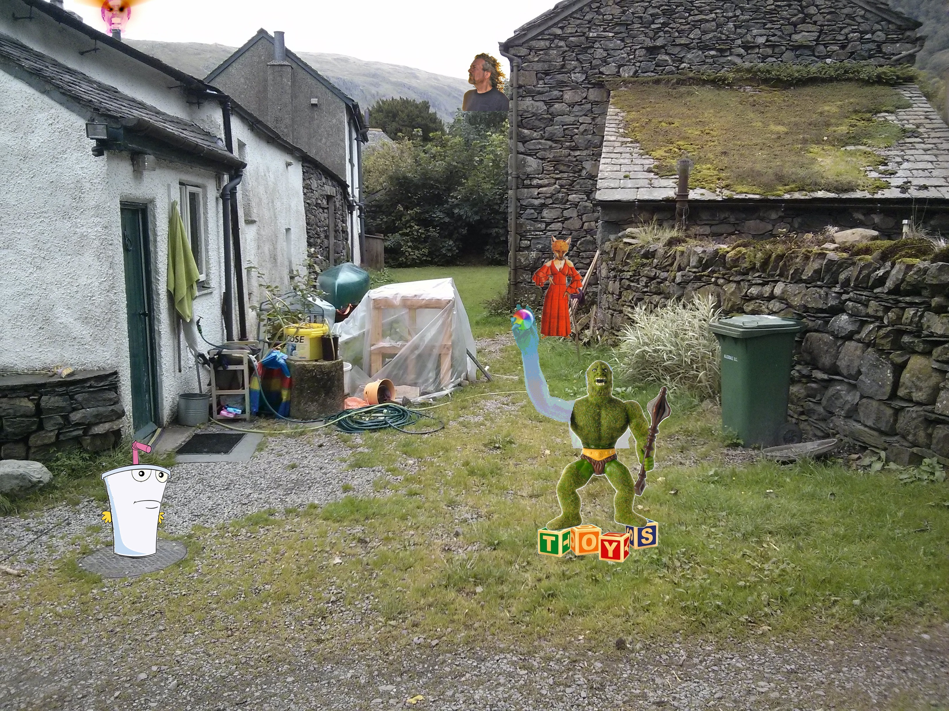 And Karoz again appears in a collage with this animal. The jackalope wears the body in Collage 11, as it were, of Sam Parr Model (SPaM). The blue robot of the red-blue-7 Stones pairing perches on her shoulder. The antlers make a shape similar to that of Sam Parr Lake, whose outline appears in the center of Collage 10 (blue, coral like growth sprouting from wall vegetation). So the jackalope represents Sam Parr in multiple forms. The Falmouth Rabbit appears in the landscape below it, the central figure of Collage 11 and the focus. A smaller Karoz’s head indicates it by pointing and mirroring. In drafts of Collage 11, I had this little Karoz appearing on the foot of the drinking jackalope. Now the larger image of Karoz is all that’s left, but in both parts of the animation and in two different positions. He appears to fall from the wall, originally held by the cartoon homeless man from Aqua Teen, but somehow also turning around in the fall to “land” on his head, which is the same as the head of Scatman Cruthers at the foot of the wall. A surreal impossibility in other words — collage liberties. Much like a giant and small Karoz appear together in that Sam Parr collage: perspective distortion there.