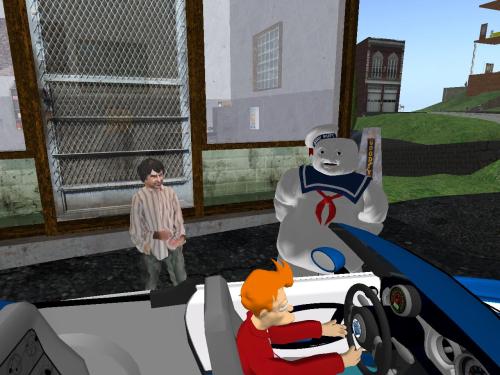 Gas tank full, Doogie retracted the nozzle and put it back in its carriage without answering. “Comes to L$18.66. You did say you had money.” Doogie then raises an arm and snaps his fingers without turning. A squat marshmallow man squeezes through the door of the station and wallows up beside him. “Trouble here sire?” he speaks in a doughy voice.