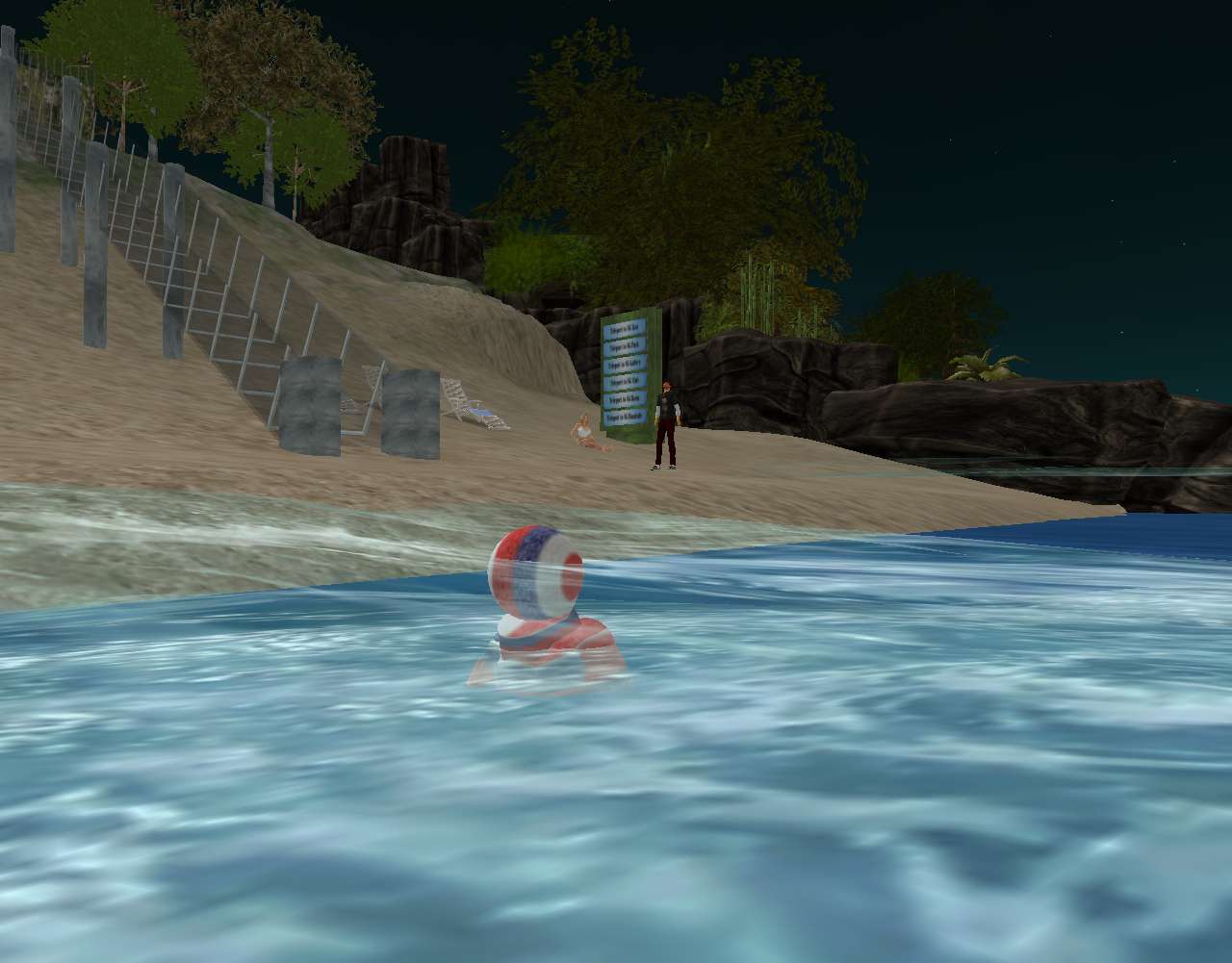 And so I think this is as good a place as any to end section 04 of the current photo-novel: a giant picture of Tally Hall on one side of a mega-prim that also pushed physical object Clocky the robot out of his walking-in-place spot in the Hole in the Wall bar at its bottom and into the Nawt Vaya Sea below a couple of days back. With the error spotted (and mega-prim deleted), will he return to land and re-claim his position beside bartender Daisy Flathead, potentially taking her place and allowing her to manage more from afar and maybe do some of that travelling about Our Second Lyfe she’s always dreamed of? But I guess now there’s Frank to think of: Frank Lynn up in the castle in the sky above it all, a potential *boyfriend*. No, her heart will probably tell her brain than she needs to stay in the area, see what develops on that front. Meaning that 8 prim Clocky will most likely remain pushed away into the waters of the Nawt Vaya Sea, gone if not forgotten. Interesting parallels here to the photo-novel 46 story of fellow marching-in-place, physical object robot Tobor a couple of sims west along another shoreline come to think of it, the ocean surrounding the continent of Jeogeot in that case. Hmmm.