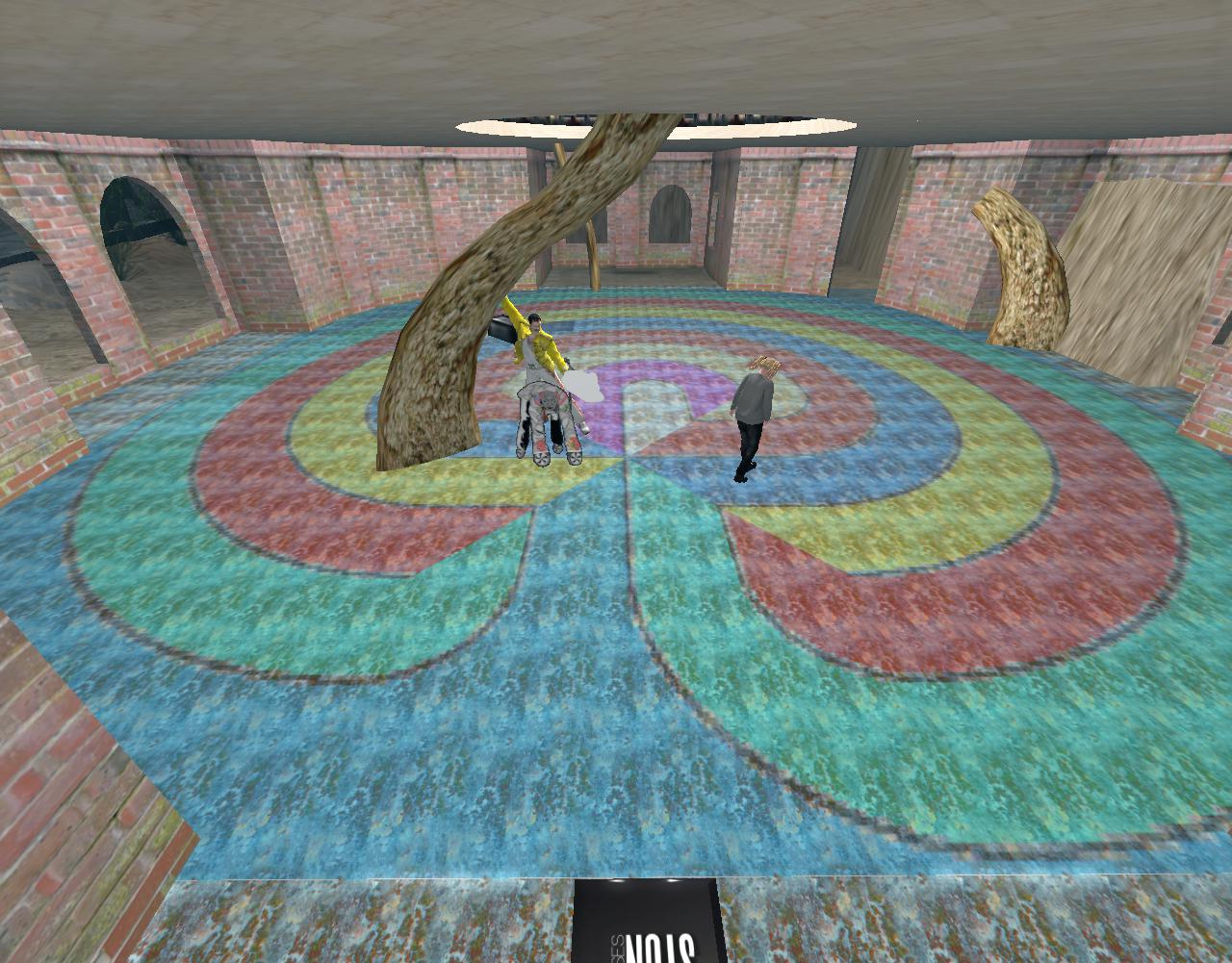 Yes, I can do this (!): use the Recorder tool on the Developer Menu to record my avatar’s walking positions through the 7 circuit Temple of TILE labyrinth, also called a classic labyrinth. And today’s chosen avatar Alice Tart here can trace the labyrinth over and over and over using the loop option that comes with the recording. It’s pretty profound. You start with blue around the outer rim, accomplishing a single circle before “descending” into the center till you meet yellow, then walk the yellow segment around to start going back out till it meets red, then walk red till it meets green, but then you don’t return to blue here, no no. Keeping to green, you stop walking outward and once again descend toward the center to meet cobalt, working inward this time to violet, then starting to move outward again through orange, then maroon, then descend again into the very center colored white to end. Here end loops back with beginning, and you walk the line out of the center straight toward the blue rim to start the process over again.