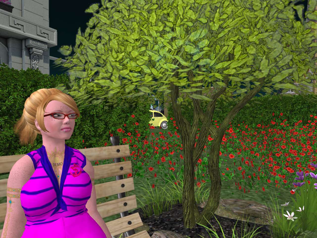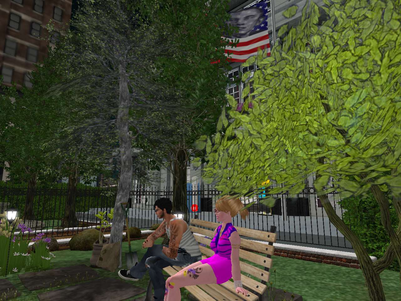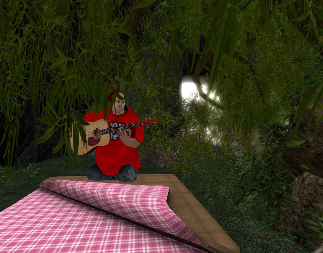 Baker Bloch and bee-person/blog guru Hucka Doobie share a pizza while Philip continued to play his game over there, watching from afar as the virtual trailer park slowly repopulates itself with killable, expendable NPCs.