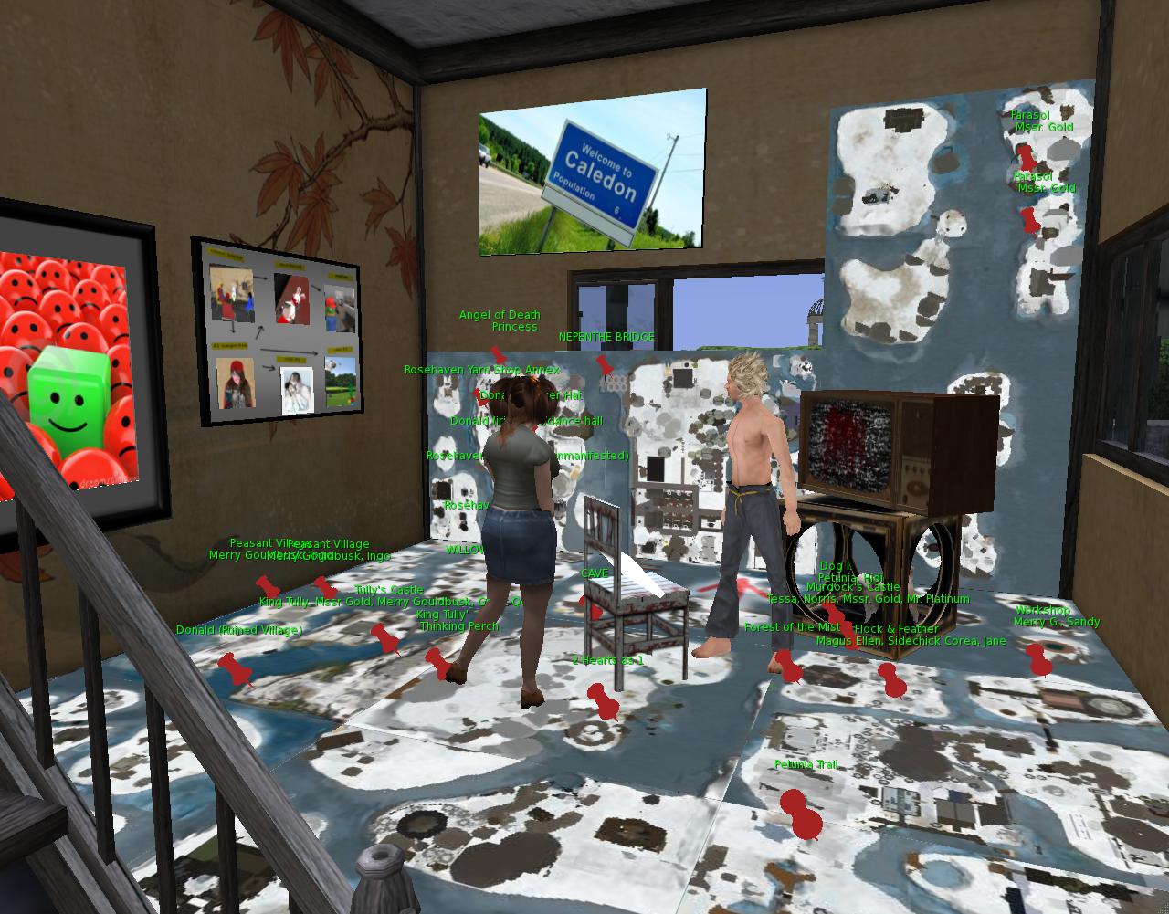 She invited them into her trailer for more talk but there was nowhere to sit and they had to just stand and watch her accomplish her stretching exercises, saying she had to do them every half hour on the button (her archaic expression) or else her ancient body would simply start to freeze up. “A bit chained to the trailer, then,” she said. “I was just joking about the being away part before, lassie,” she spoke directly to Sarah. “I just don’t have a dot to be a presence.” Sarah checked the in-world map again in her head. Two green dots together apparently representing her and Al beside her in the sim of Coyote Canyon here. But no third. Mid-Hazel was right. What *were* they dealing with here?