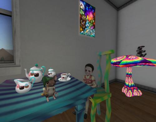 “We’re *all* sick,” the child opposite him at the Mad Hatmaker table spoke up. “It’s the magic mushrooms in our tea and coffee. We — didn’t know.”