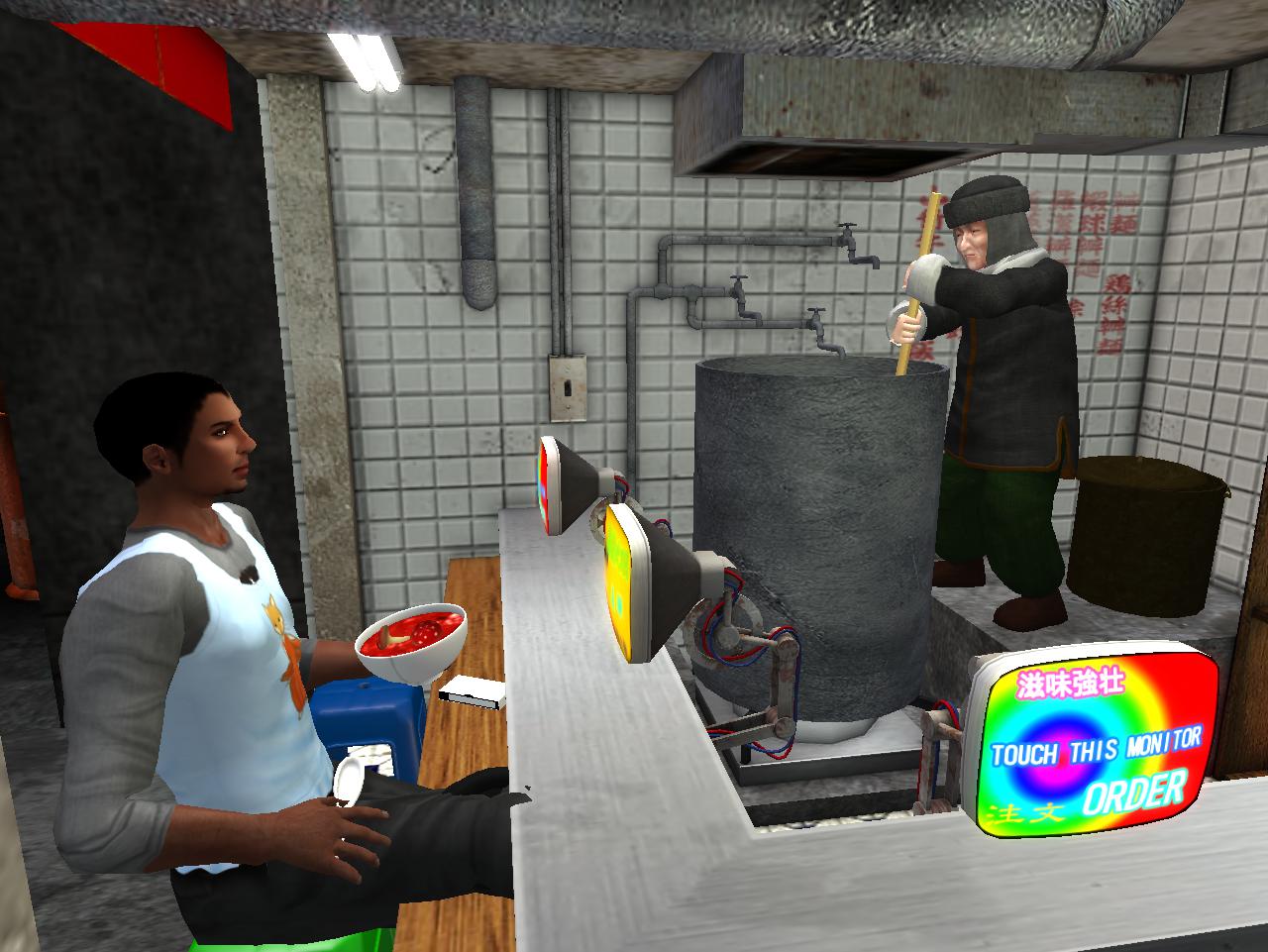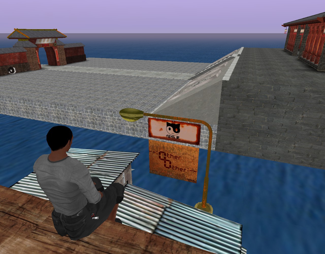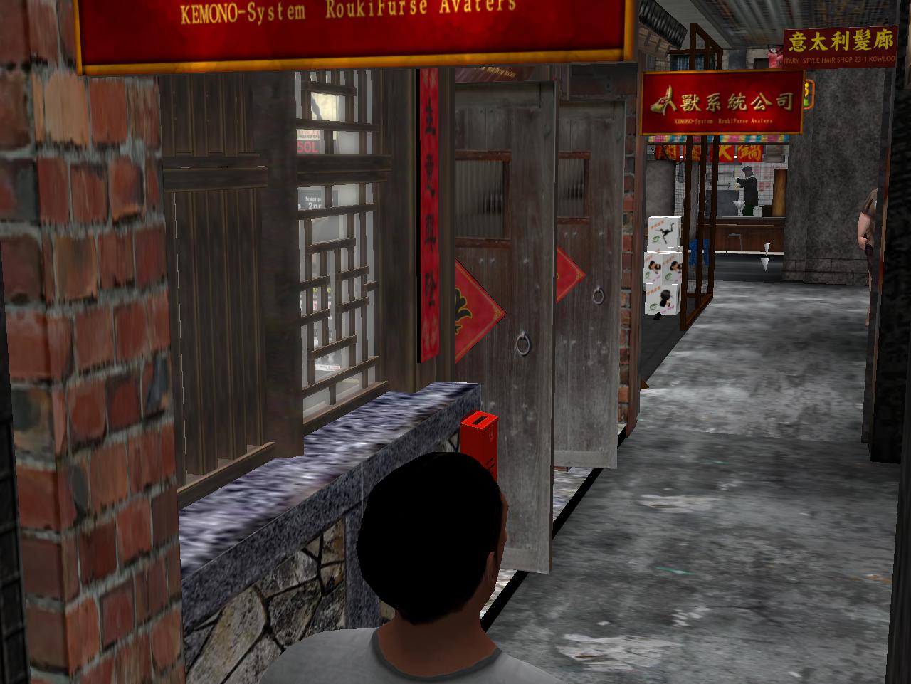 So Newt/Baker Bloch started looking around the various shops spread across the twisty-turny alleyways of Kowloon’s Gate city in search of the “Greg” avatar Mr. Moon used as the star of his fabled “Ticket to Hell” movie about the pitfalls of Our Second Lyfe. He purchased a cheap Mr. Moon t-shirt found on the marketplace to, in his mind, help bring him luck, and sweet talked Wheeler into buying a women’s version of the same. Below we see her joining in the search; she had some almost freebie female avatars she wanted to purchase here anyway, as observed by Newt and, above him, by me the user of all. Then a 3rd version of “me” entered from the rear.