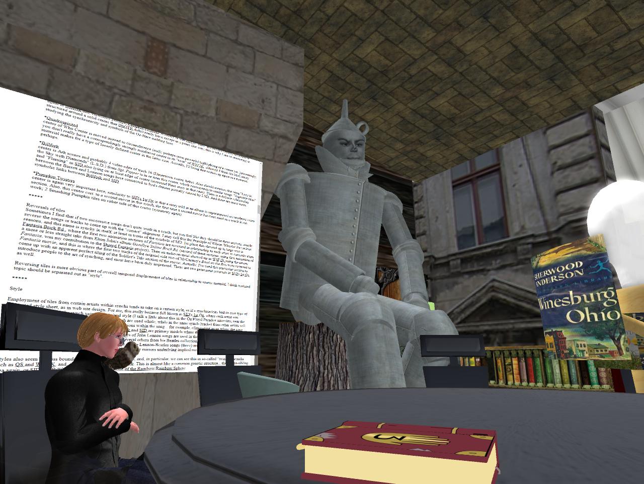 “Okay.” Wheeler Wilson scrolls down. “Lot’s of stuff about *other* synchs here…” She continues to scroll. “All right: ‘I’ve talked quite a bit about the structure of my finds so far, but one could go much further in this. I’ve only talked about it in terms of tiles and tiling. It would be interesting, for example, to study the perceived *centers* of synchs. For Pumpkin Twisters, to give an example, the obvious center is the selection from the secondary movie 200 Motels, overlapped with 2 tracks from the Kinks’ Preservation Act 2, and this is also the place where the synch is most obviously [quote unquote] “synchy”, or, in other words, there is an obvious match or synchronization going on here. The center of Billfork is the ark scenes and the aforementioned — in the last post — heavy *video* editing in this center…'” Here Wheeler Wilson stops and turns away from the media feed. “Ahh, I think we’ve read enough of your old writing, Baker Bloch. Time for the new. Are you ready Tin S. Man?” She takes her customary seat at The Table.