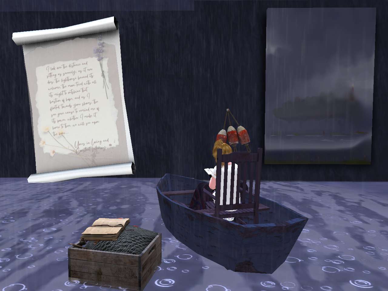 As they arrived back at their apartments, Lexi invites Shelley to help her unpack the big plywood cube from Montana that arrived yesterday’s day before (Saturday). “Get this,” she said. “There’s a robot dog in there just like from my childhood. Can’t *wait* to put it together.” But then Lexi remembered the likewise plywood colored pictures on her living room wall, the shells and, especially, the keyhole with the beautiful girl inside, Lexi’s representation of Shelley as Fern had already determined during her visit several posts back. “Uh, just remembered my apartment is a mess,” she backtracked. “Need to clean up. Maybe tomorrow, he he.”