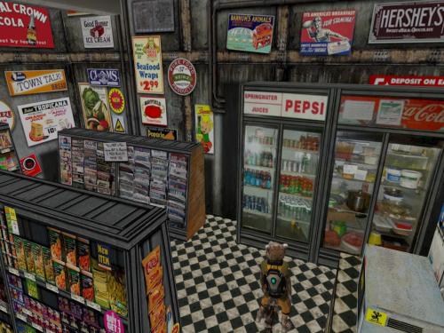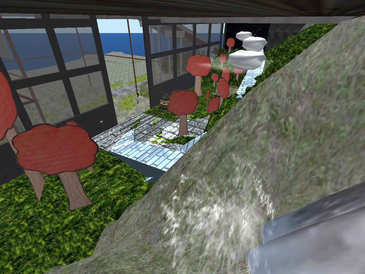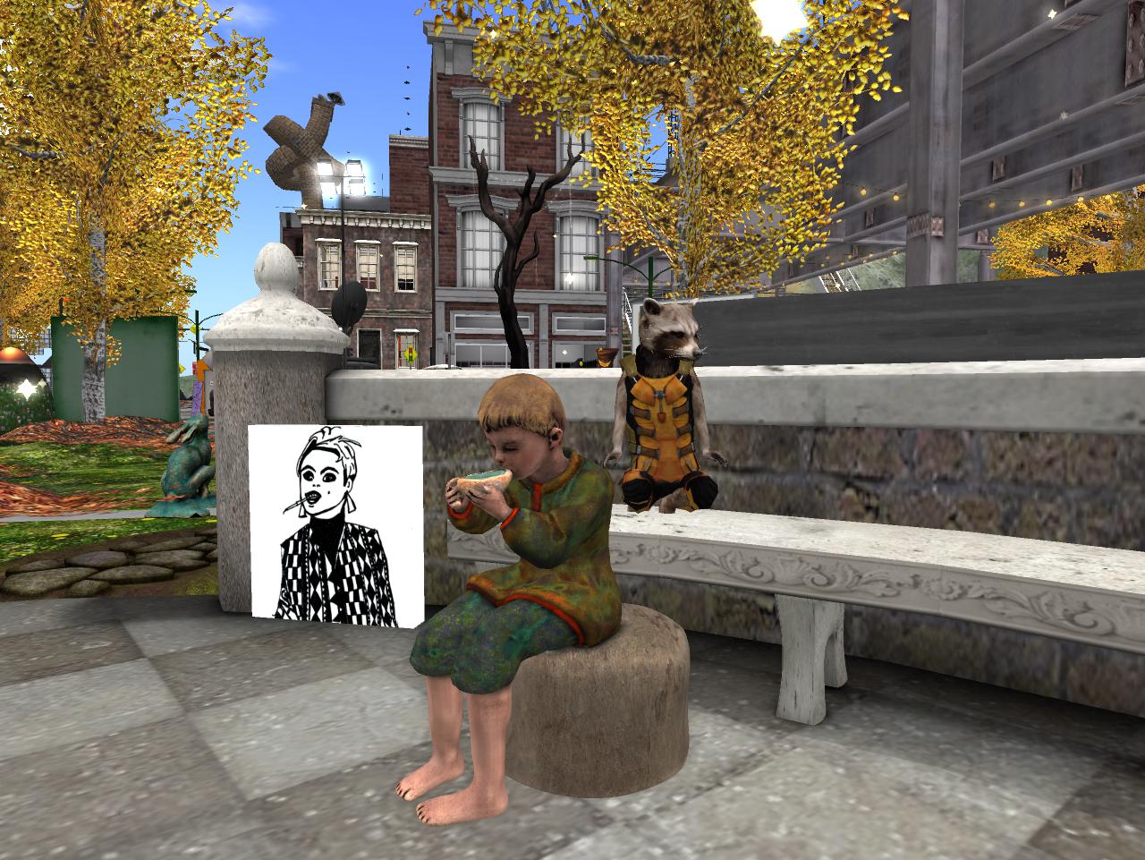 Yes, he remembers now. The last remaining, actual grass of Grasslands, along with the sand dunes portal, had to go away to make prim room for the upstairs art gallery. And local punk band Story Room lost their remaining OLT venue since the theatre space formerly there was also eradicated, and this just after they were banned from playing at Clownski’s after a new noise ordinance was passed by the town council. Our two local bands, lost in a single stroke, he ponders. Rocky thinks of another old saying: Lamb dies with Ram. Baker Bloch tried to prevent it from happening by moving the future focus back into the here and now of the present. Yes, Rocky has his market, has a bar, has a small gallery even. Things are good in October. But even November can get snowy, and the anthropomorphic animal longs to see Santa Claus without Jack Frost always tagging along and nipping at his nose.