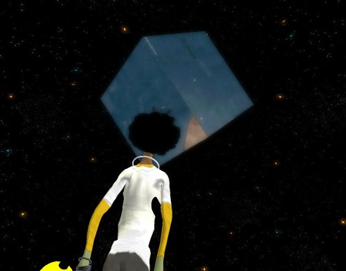 “As you wish.” Hucka D. points upwards. “I know that’s the Earth over there but what is this? Obviously the Blue Feather Sea remade as a cube, or the 6 composite sims folded up as a cube. But is it real? Looks kind of transparent to me.” She keeps peering upward, seeing stars through the predominantly blue cube. A triangle of stars, actually. She’s connecting the dots again.
