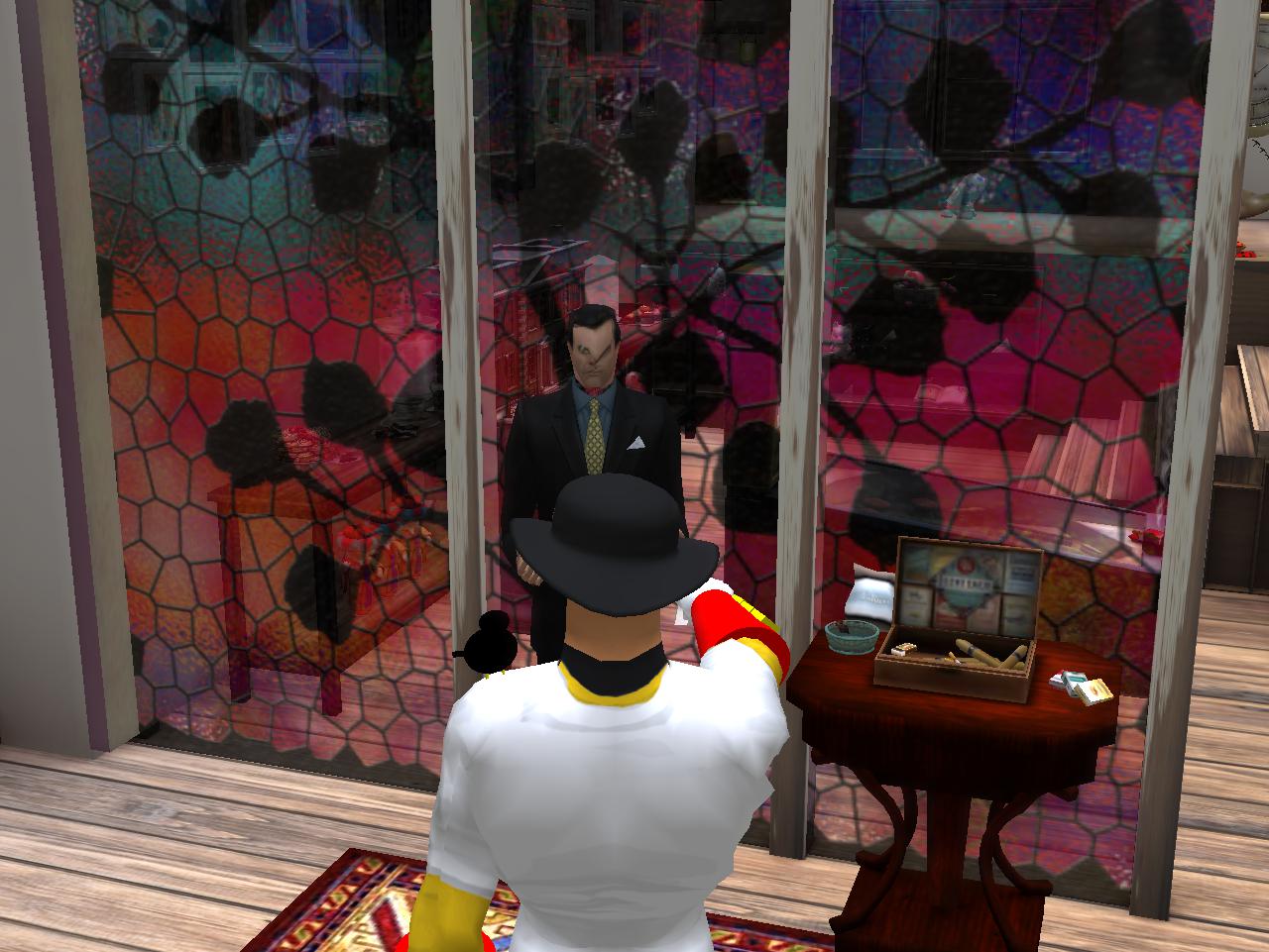 “No thanks, I already have one,” I said to the greeter in the front hall, a nice enough bloak. Too bad about the facial wounds for the fellow; maybe holds him back in life and keeps him here. As a servant at the door. “A smoke, I mean. Here. In my hand.” He presents his spliff possessed appendage for the cigar offering greeter as an explanation.