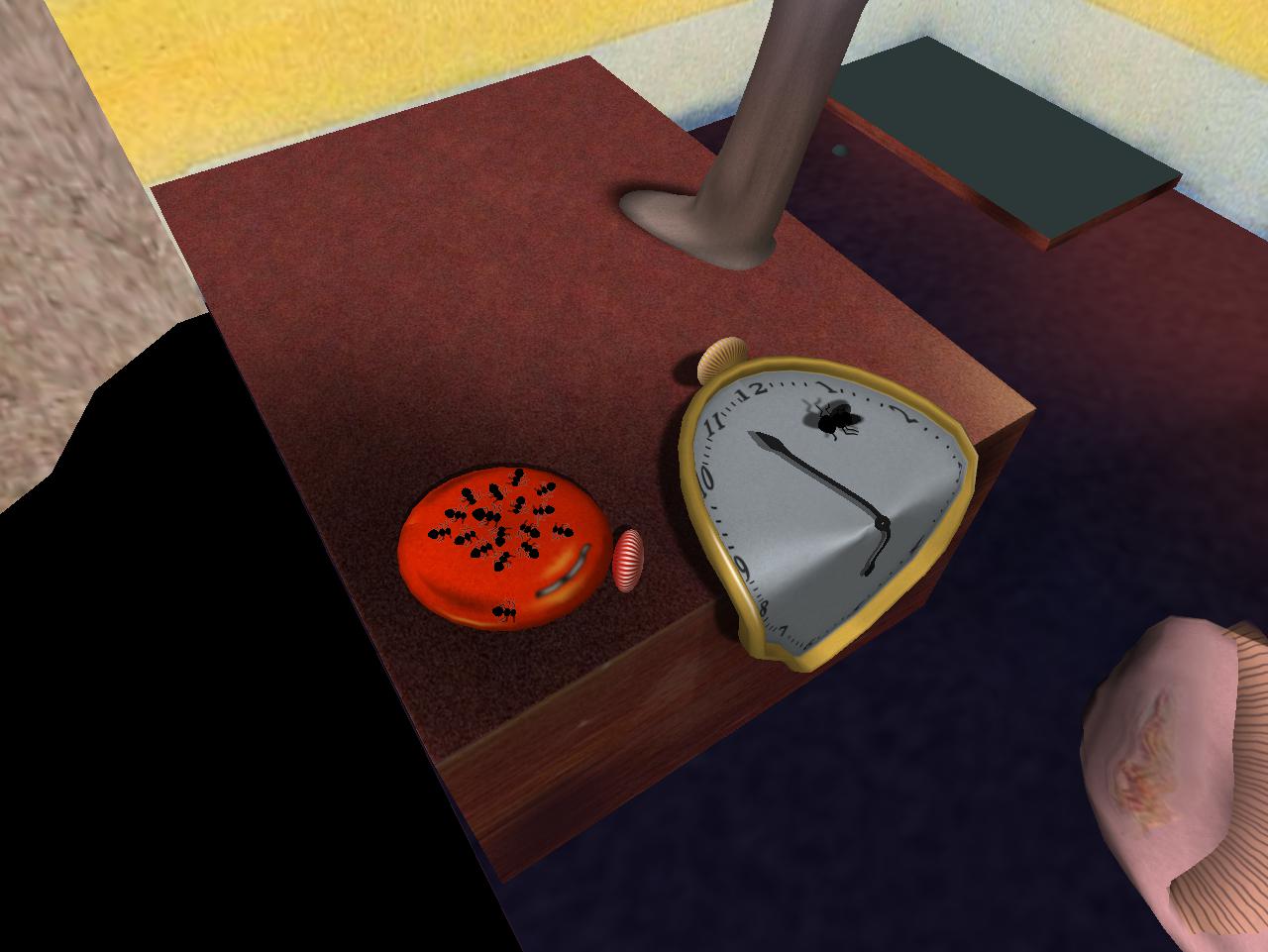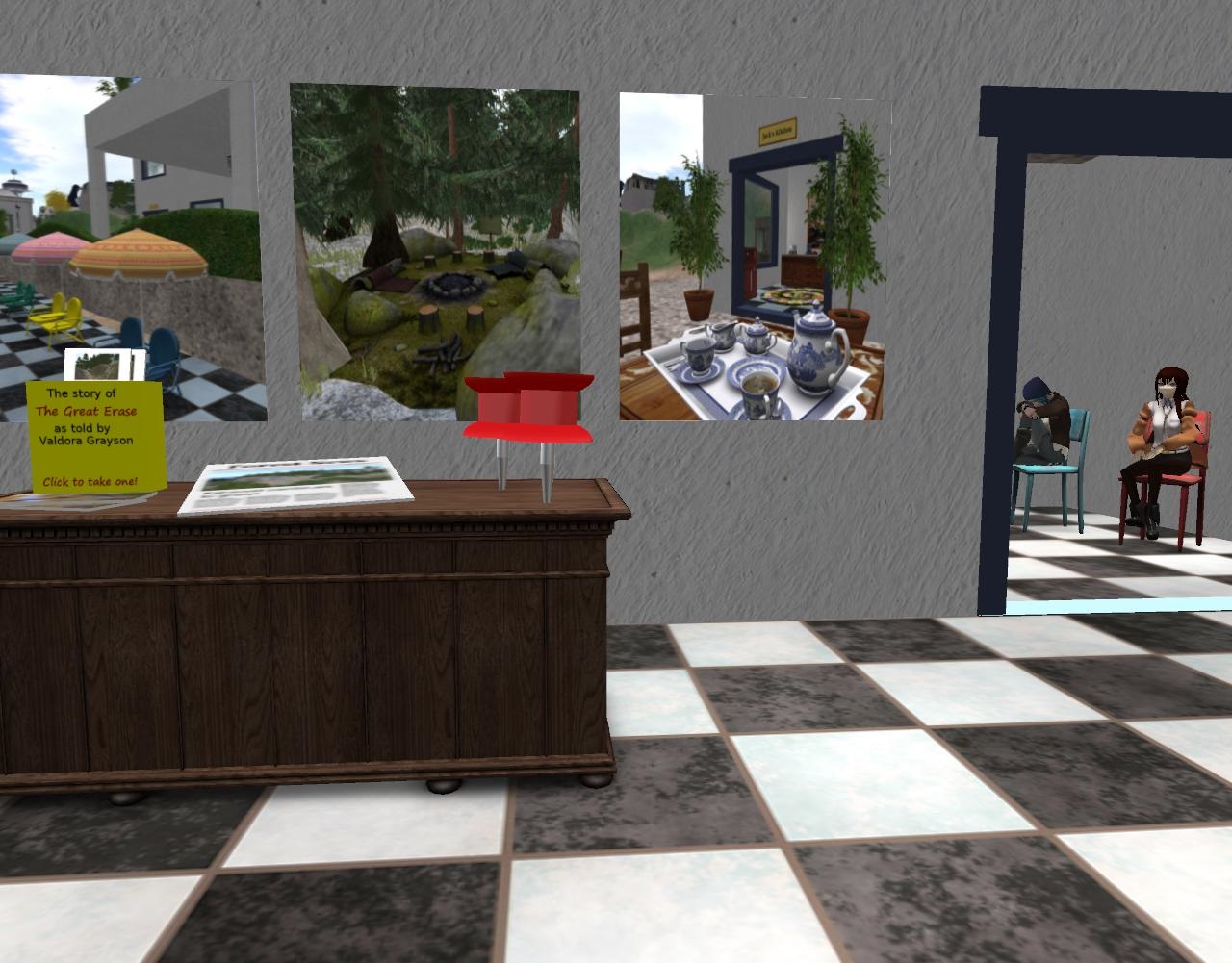 Baker Bloch was glad they visited the other house, because he found a number of additional objects he could copy and take back to Collagesity within. Afterwards he tried to read a book on the table but found it was a 3d tableau instead called “Hope Springs Eternal”. No interior pages. Karoz was looking over the backwards letters on the wall below the copyable posters.
