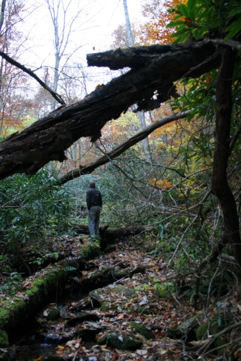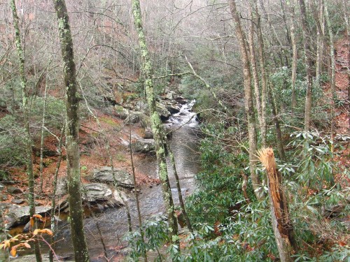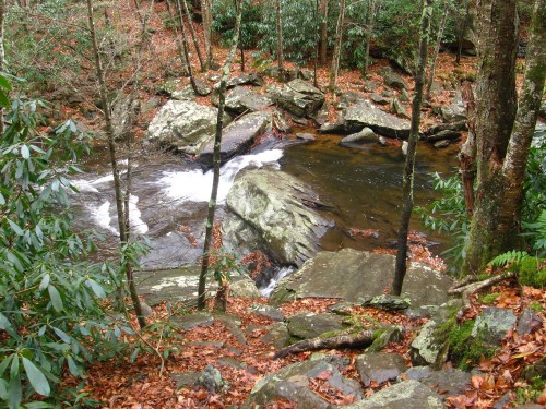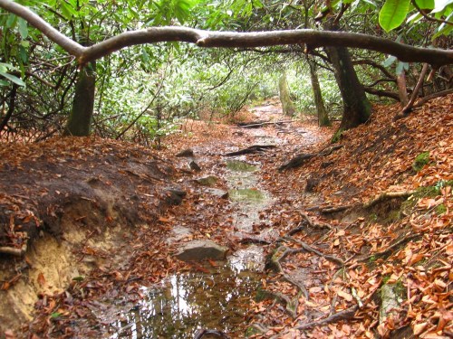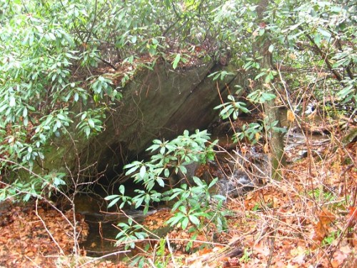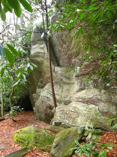 Then in continuing on the loop, we descend into the rhododendon forest and follow Bee Line Creek for about a mile to a mile and a 1/2. The trail runs by 3 larger rocks after the rather steep descent from the meadow, leveling off in the process as it begins to parallel the creek.