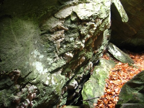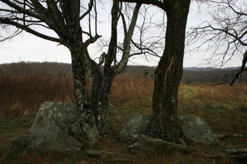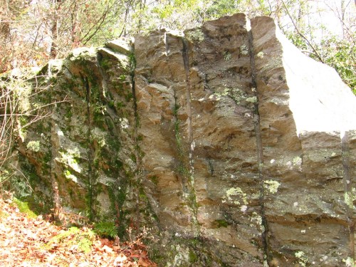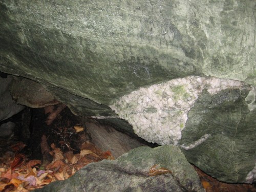 From the Weaving Place — which I might rename in light of the inability to actually weave the Bee Line here in any successful way — it was a fairly sharp descent through the open woods to the trail on the northern side of the mountain, also traversed this past weekend. Having failed with my weaving project just up the hill, my fantasy inclined attention instead focused on the queer rock art found all along about 800 feet of this trail, or what I now consider to be a true outsider art piece probably on pair with even Dongoba’s profound rock temples discovered in late 2011.