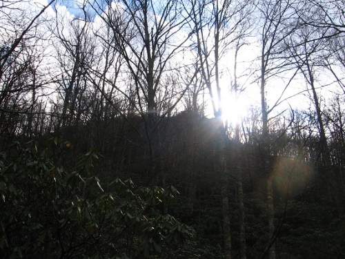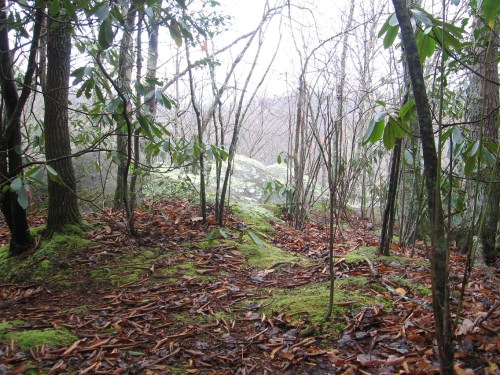 Parked my car on a dirt road just off The Way, and hiked up some kind of old road to reach the site of the first picture below. Actually, just before this I examined a place on the other side of the road that *does* have an entry for it on my previous blog, a place I called Notherton there, and where mossman Gene Fade supposedly lived and worked at one time. Nothing new found there this fine, blue day, so I decided to focus on the mtn. across the road, which I’m temporarily calling Gene Fade’s Mtn. until I get a better name. For on the slopes of this mtn. is where Gene Fade was actually born, in a small village called Jupiter Rock. The below picture comes just uphill from this rock, but I was unable to reach Fade’s fabled birthplace this day because of blocking rhododendron. I’ll have to attempt another day, and believe me if I was off today and it was sunny instead of drizzly, I’d be wandering on Fade’s mtn. again for this and other reasons. As it is I’ll have to wait till at least Friday.