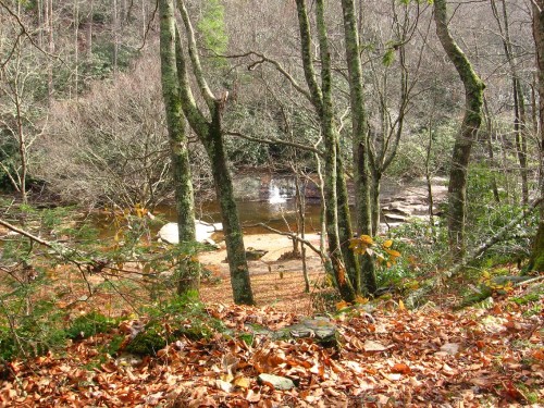 Today I returned to Cache Creek in Frank Park. I first uncovered this stream last December, and was amazed at the magic (white rocks, cascades). The return trip proved to be less inspiring, and I think it was all the newly fallen leaves covering up a lot of the creek bottom and sides that were to “blame”. The rhododendron around the creek seemed harder to get through this time, and I also got the dreaded “wet foot” when I slipped at one point a bit. Still I was pleased to find the open space next to the largest cascady area (most easily accessed, perhaps, at the top of the horseshoe bend of the creek coming before this) still pertinent seeming, and maybe the site of a future toy happening or future camping spot. I didn’t take any significant pictures this day.