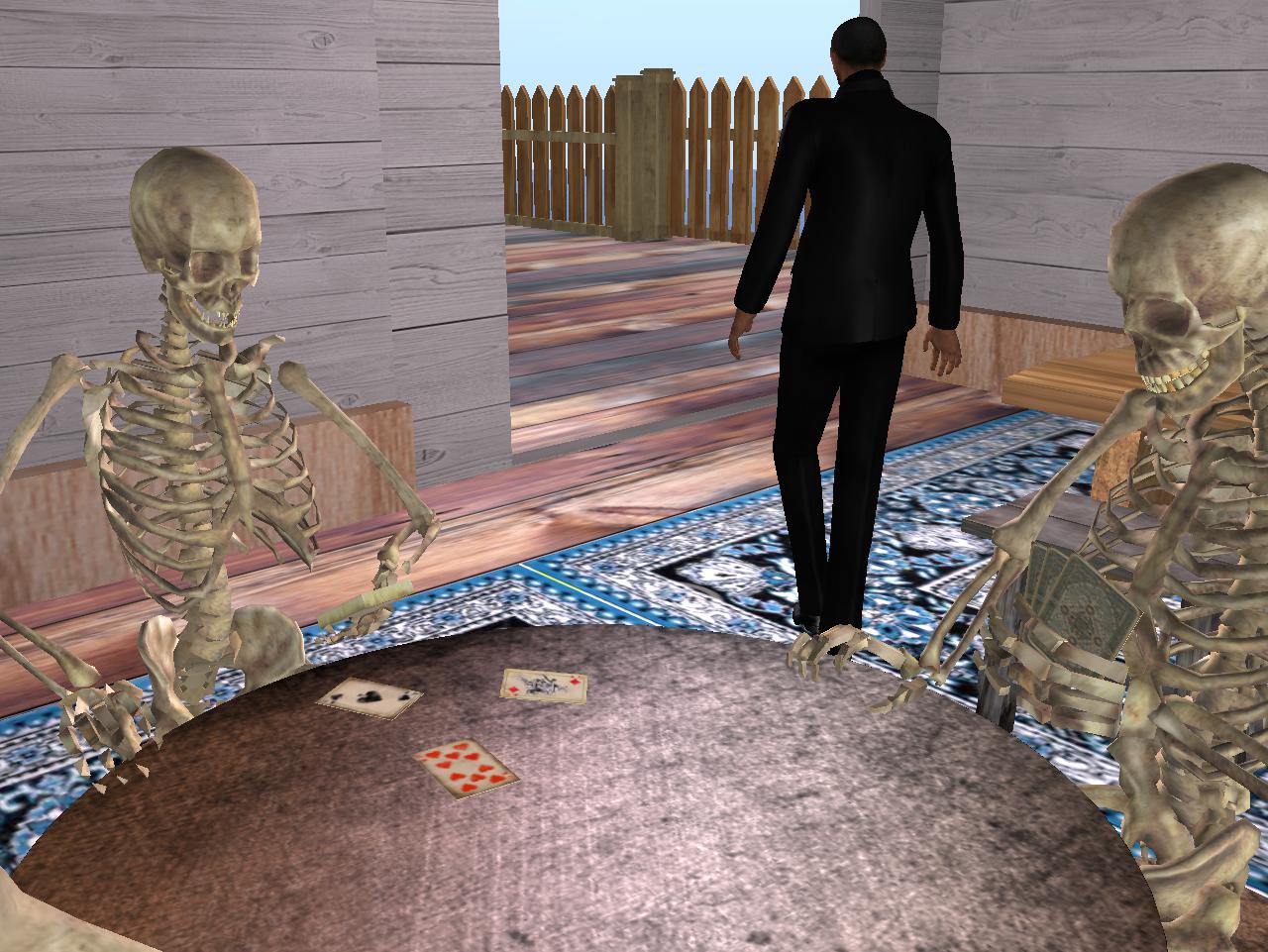 With his quicksilver mind from all that pirating business down through the years, Red Dead Beardy Head thought of a compromise. “*Well*,” he started the new pitch. “Since red and black are both card colors, 50-50 for each, how about a card game. Say: Poker.”