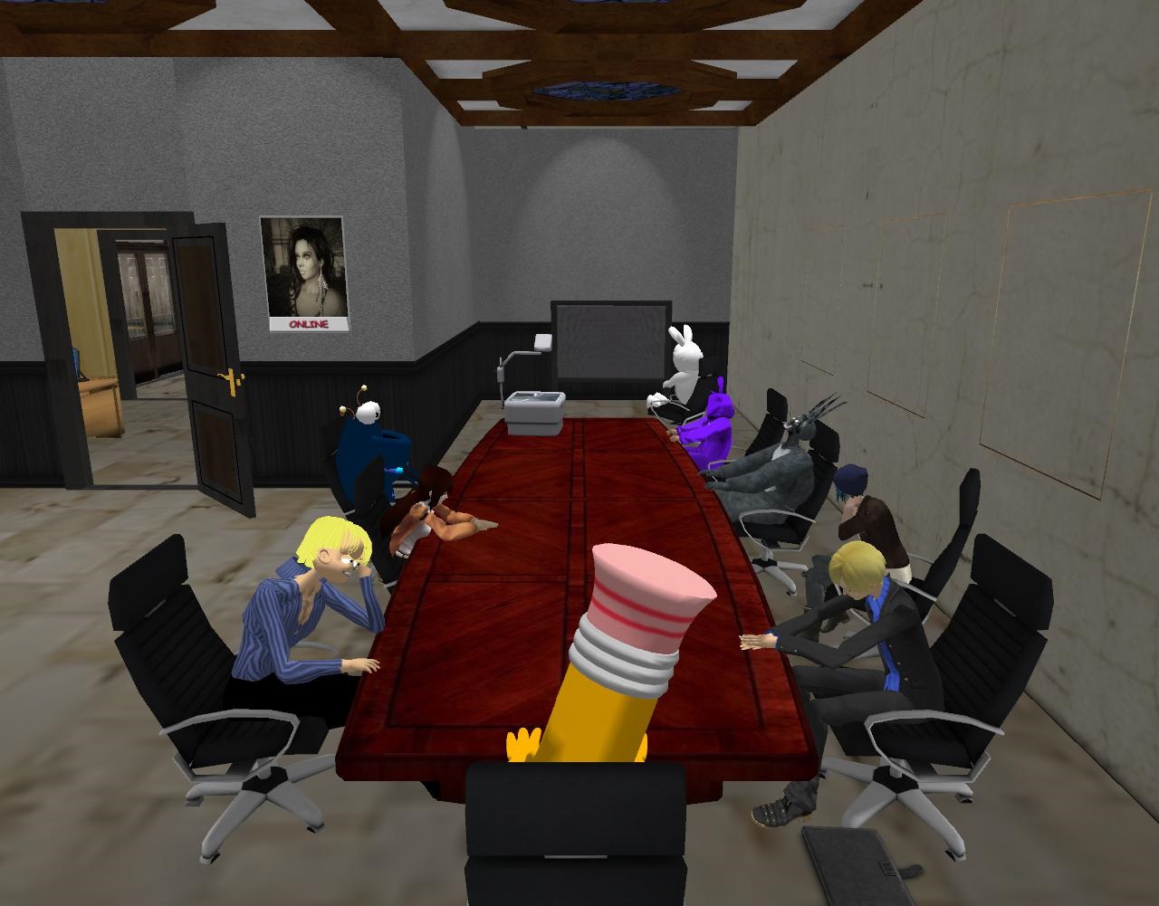 Eraserhead Man laughs out loud. “That’s what I love about you, Jill MacGill from Farmington West. *Spunk*. You got it in spades, you and Sandy both.” That’s when it occurred to EM as well that the two would make a swell couple. He decides then and there to work that potential love interest into the script somewhere. Maybe the other two of the doppleganger pairing — Desert and Chloe — *hate* each other in contrast, hmm. EM had trouble shutting his mind off of possibilites. “But we must move on. I assume everyone knows Frank, now. Franklin Bowers.” He indicates the nearest and also darkest and tallest rabbit of the 3 at the meeting. “He’s going to play a man– er, a bunny man with that exact same name, although he’s always just addressed by his first name. Do you have any questions about what’s going on Franklin? OH, and beside him obviously is the lovely Rabbit 02, whom we’ll call Patsy in the production.” EM stops here. “Nah, let’s go with Peggy instead. Peggy,” he repeats. “Change that in all the scripts, Mary. Mary?” He looks around but Mary was nowhere to be found.