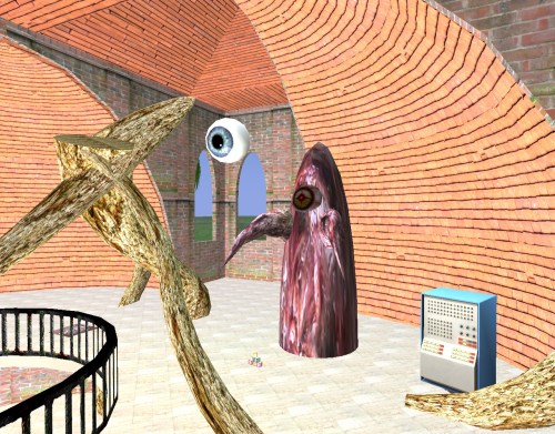 Just later we found out that Carrcassonnee herself decided to become the sign, just to switch it out for a while. Her various olive limbs were separated out and tightened or rolled up a bit to become arranged as the numbers — 6 prims both, then. Only the 7th, her *eye*, remains within the Temple of TILE. Until the end of the month that is. Or thereabouts. Everything seems to be “or thereabouts” in this here Urqhart location for Collagesity (or thereabouts).