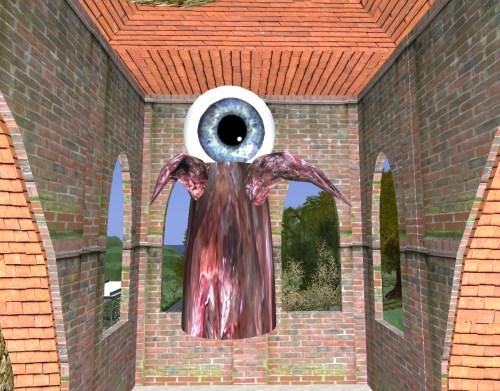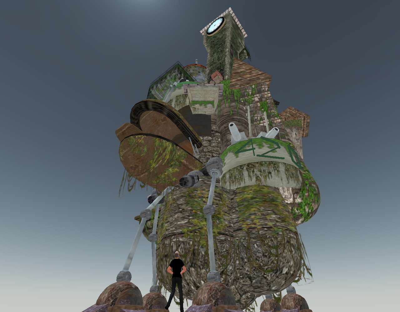 He’d manifested it from below but he didn’t know what laid inside yet. The 420 attached to the outside that had rezzed in in the meantime seemed to be a type of warning. Frank lies within, the dismantler and then rearranger of Carrcassonnee to turn her into this sign. It had happened before, he knew. On her 420th birthday, now 4 years in the past. Time enough to turn the tables of power. He had the eye, the top of the pyramid, all seeing of course. Like Carrcassonnee *use* to be when she possessed it instead. Frank was after the eye all along, eye on the prize as it were. But what about Gus the fire demon caretaker which also must be present within in order for the giant moving castle to appear here in the first place? Time to find out. He looks for a door.