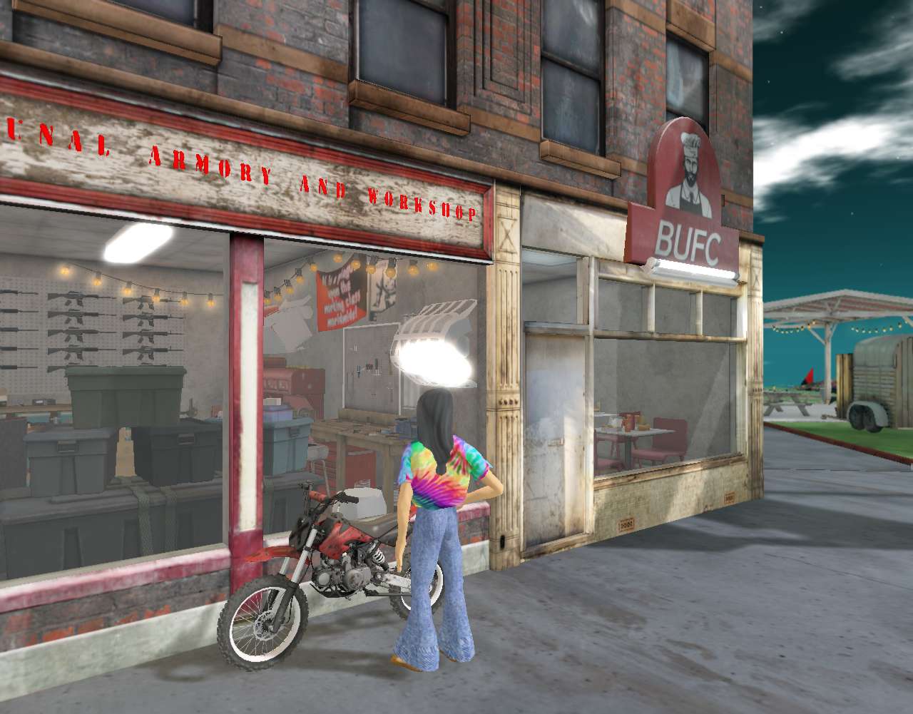 Attracted by the smell of gunpowder and old rifle grease, Charles Anson pulls up to Rodentia’s Communal Amory and Workshop on his motorcycle, intent on going inside and buying a couple more weapons if he finds them adequate for his needs. But his attention then shifts next door to the BUFC sign. He’s seen that logo on a bucket of chicken his assistant Tony was eating on the set of one of his Gorillaz videos back in the days. BFC: close enough.